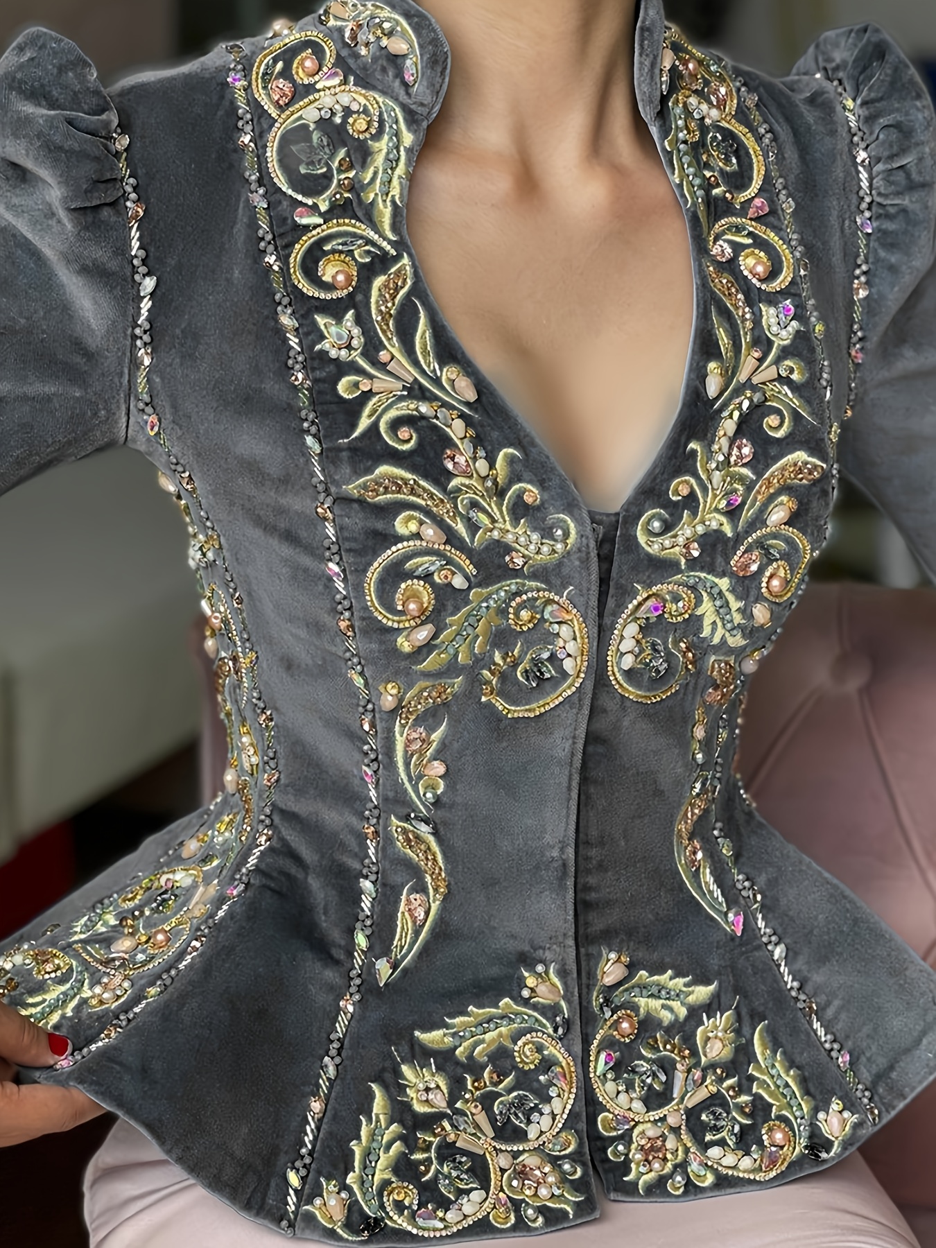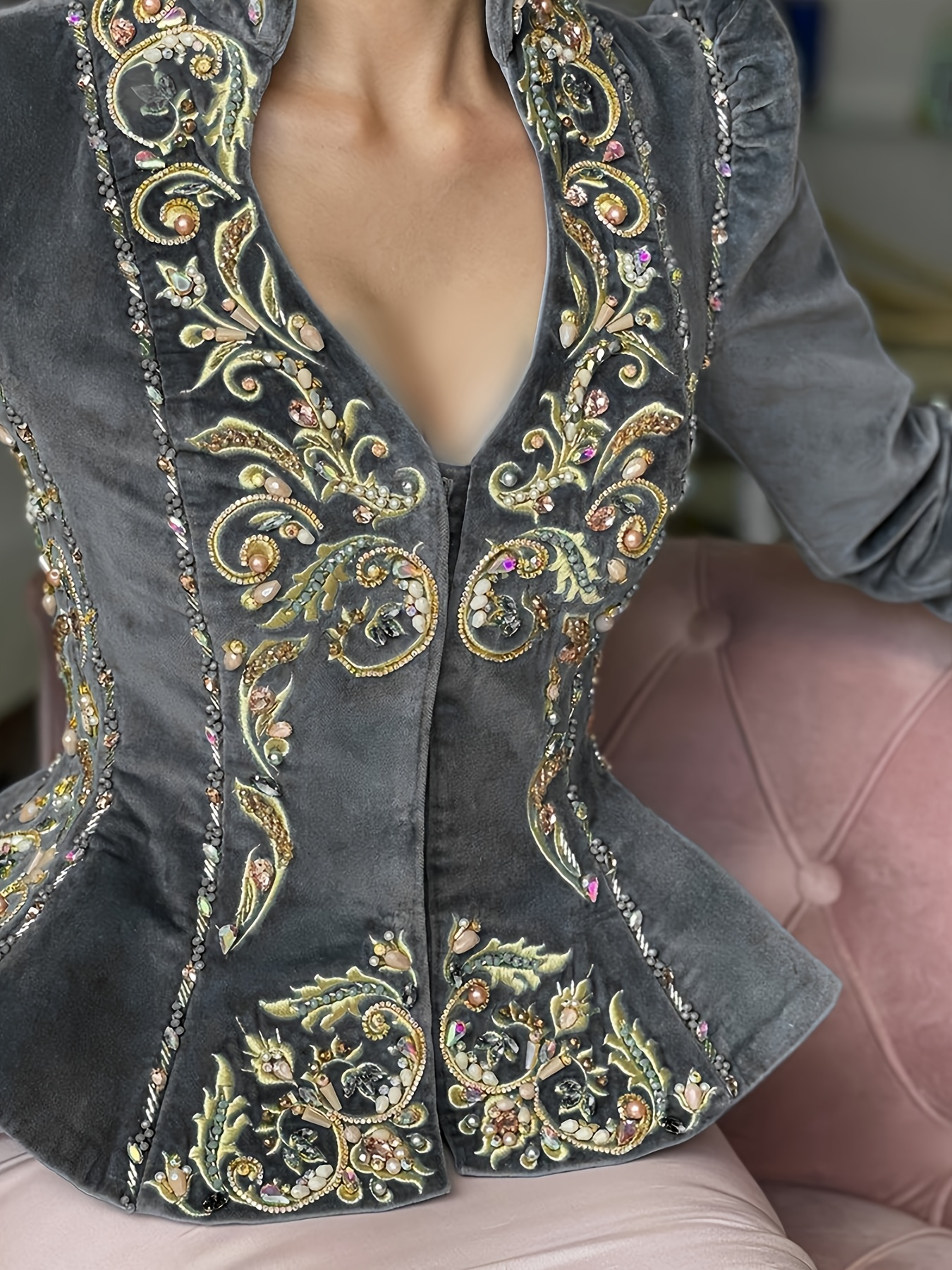 Elegant Floral Deep V Neck Peplum Long Sleeve Velvet Blouse