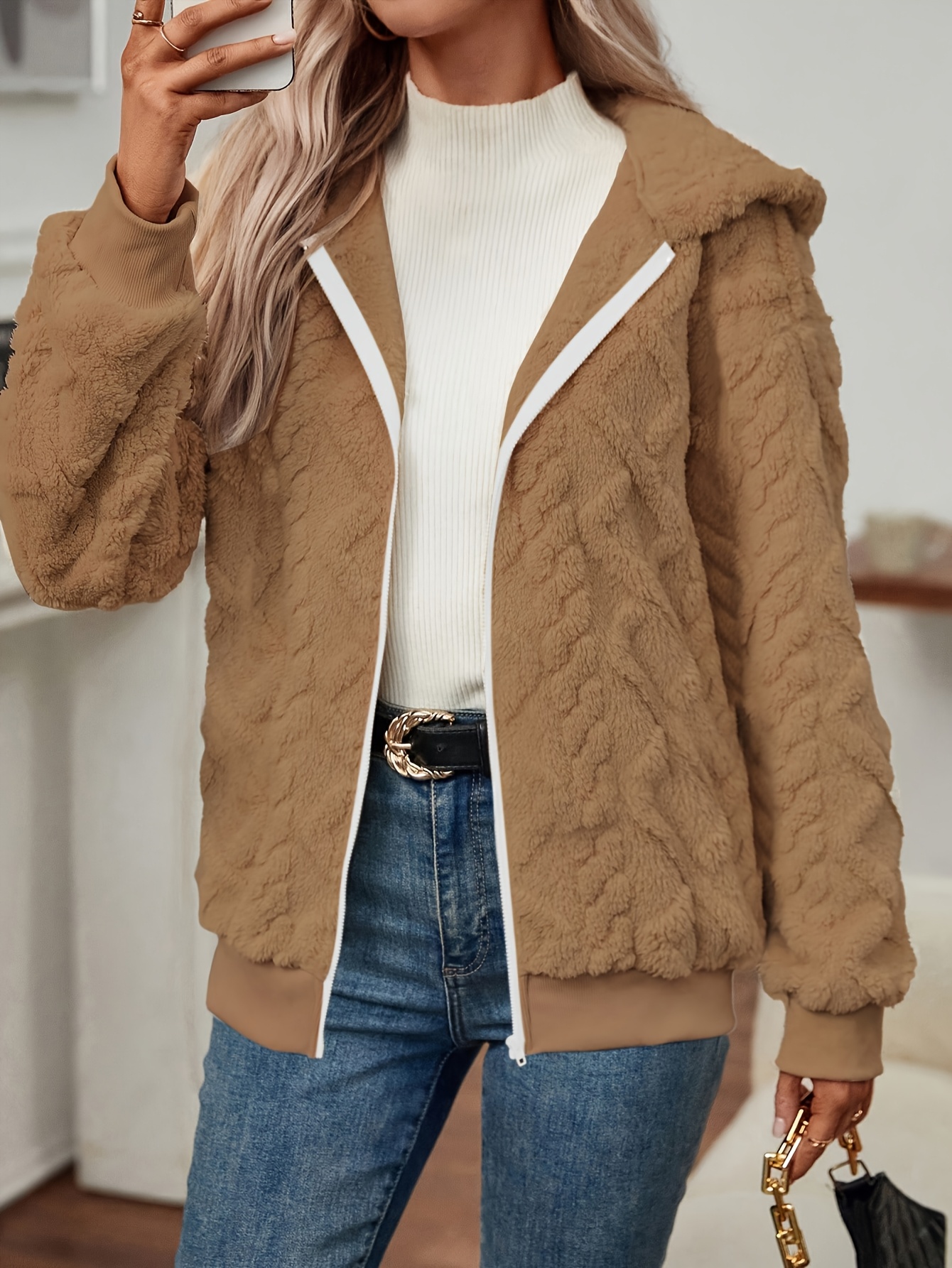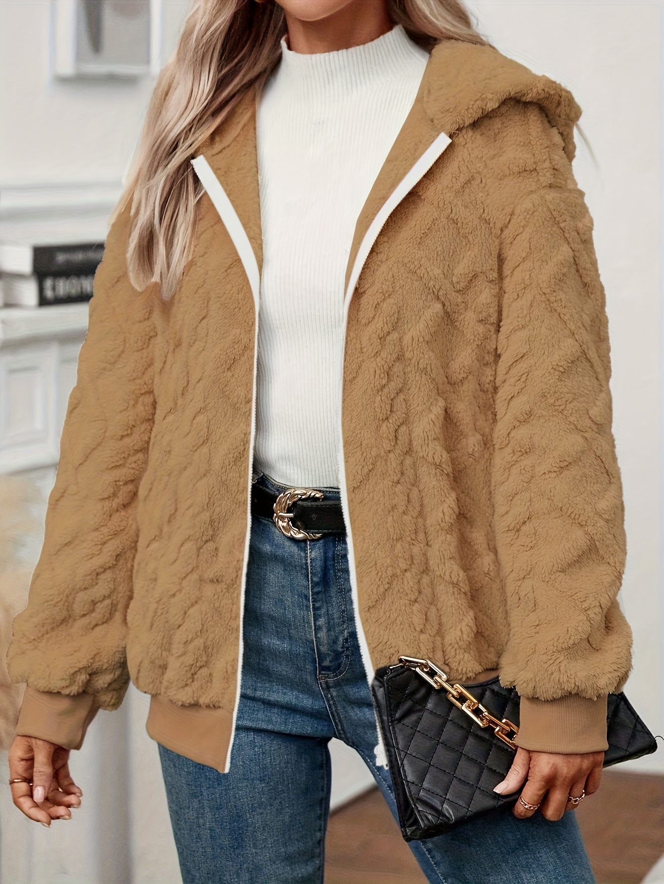 Elegant Hooded Fleece Coat with Plush Faux Fur Lining – Machine Washable Winter Coat with Zipper Front & Side Pockets, Solid Color Warm Outerwear for Adults