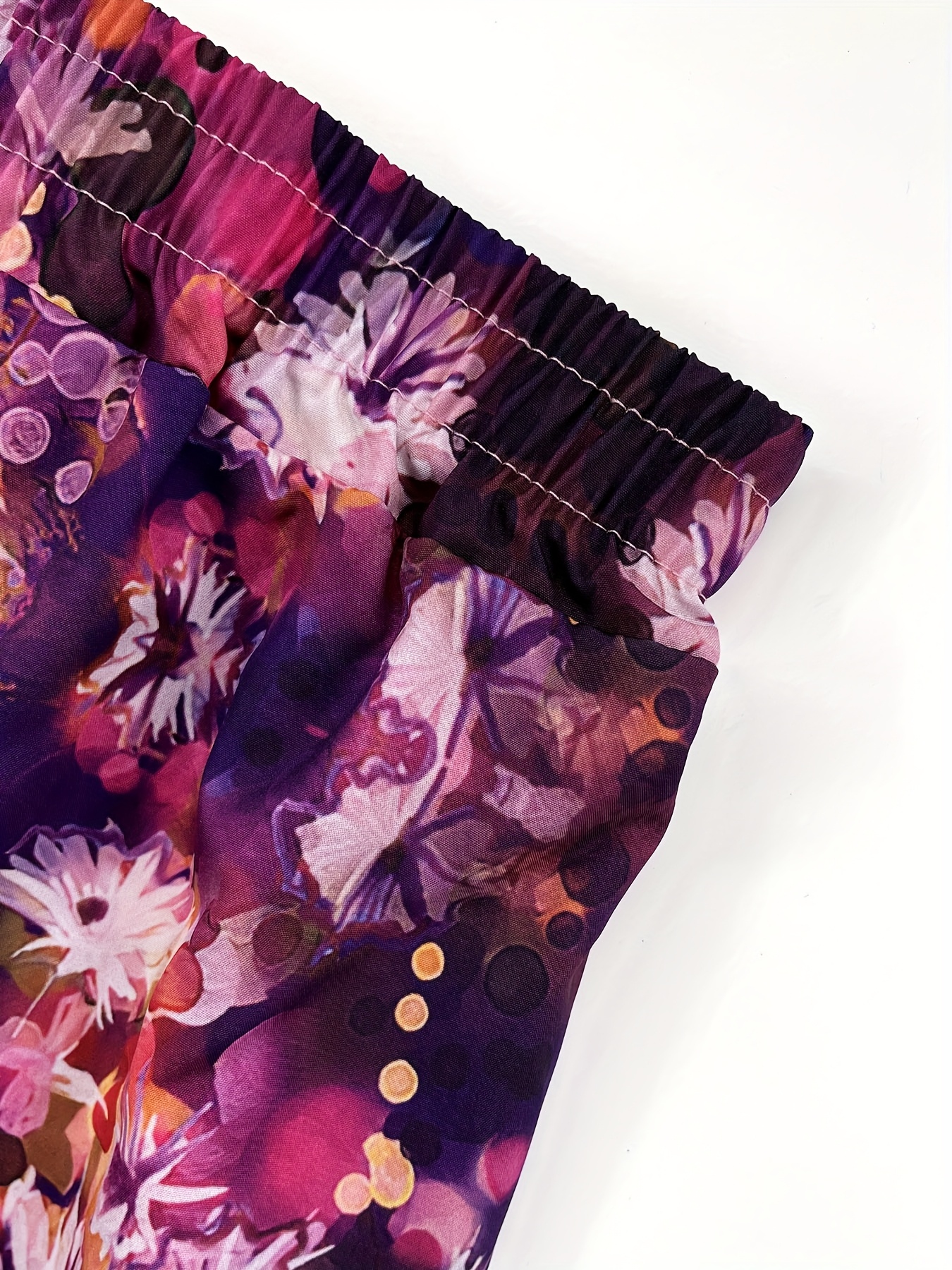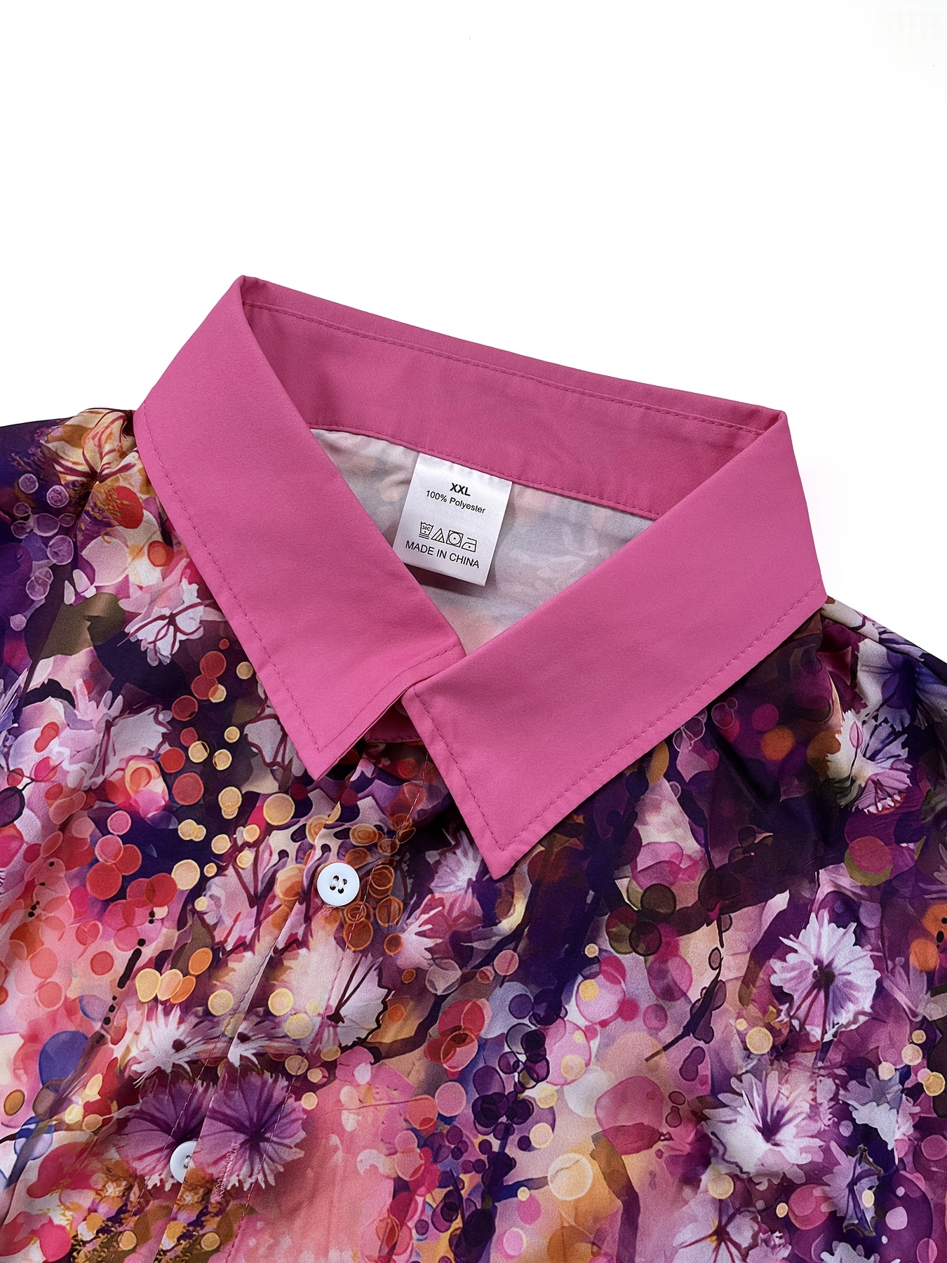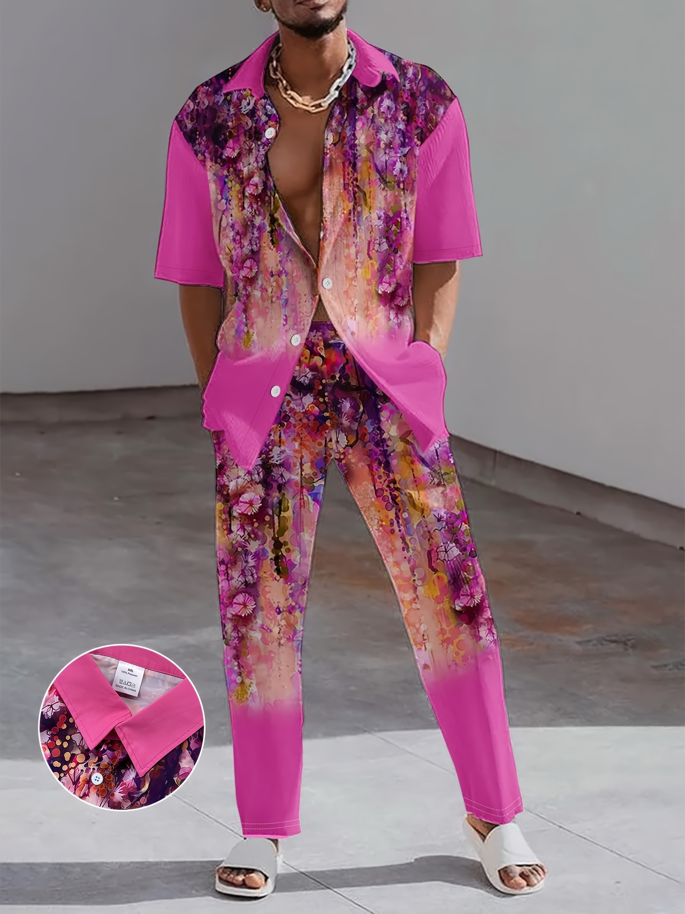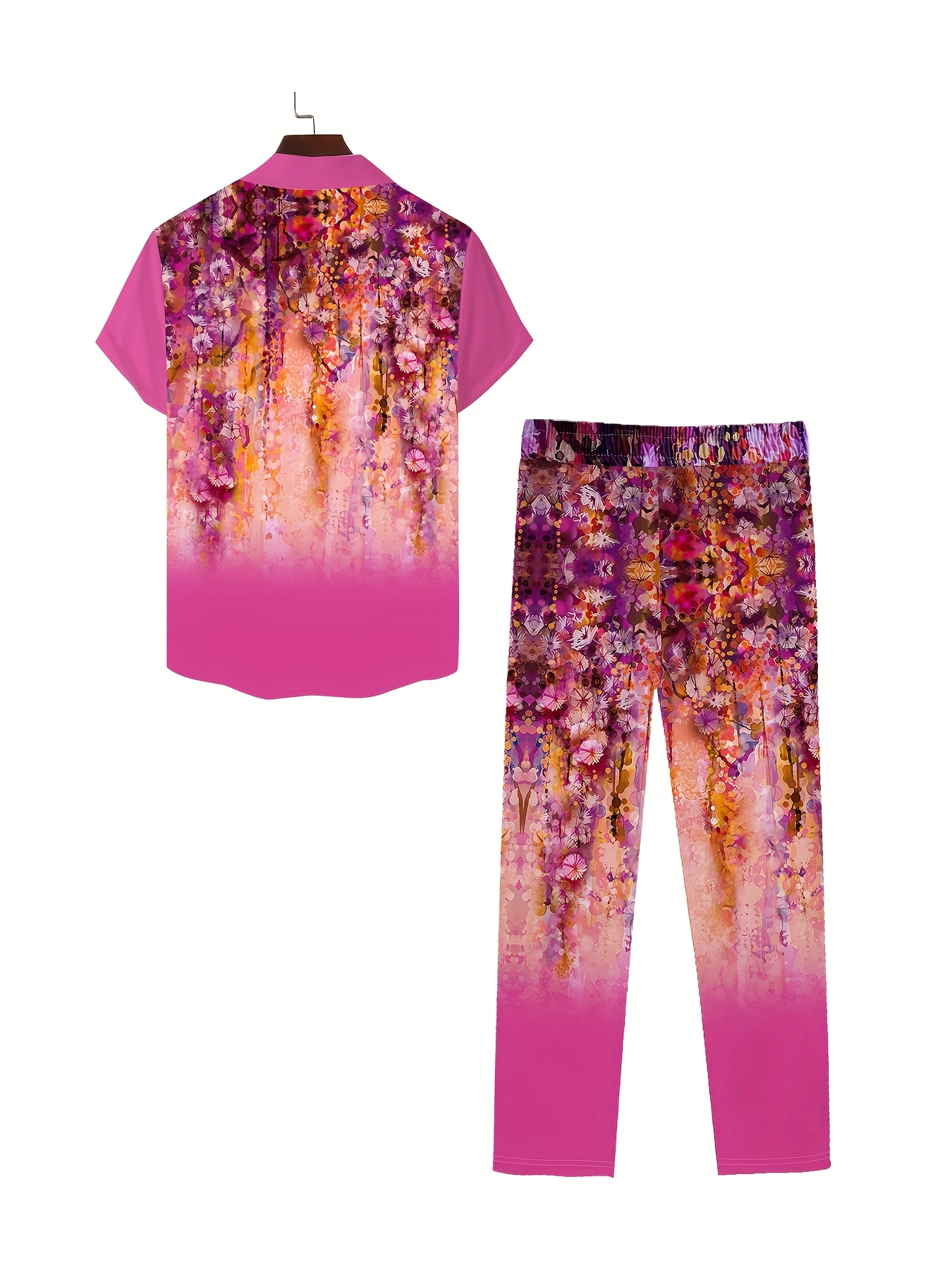 Men, UncategorizedMen’s Casual Floral Print Short Sleeve Shirt & Pants Set – Vibrant Pink & Purple Floral Design, Button-Up with Pocket, Polyester Fabric, All-Season Wear, Casual Attire|Floral Print Shirt|Polyester Fabric