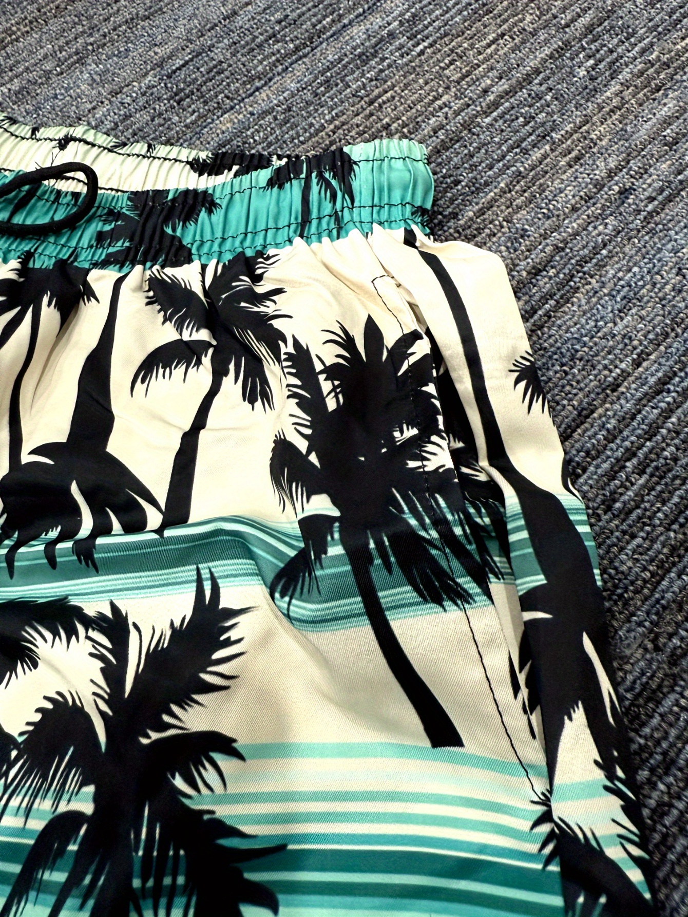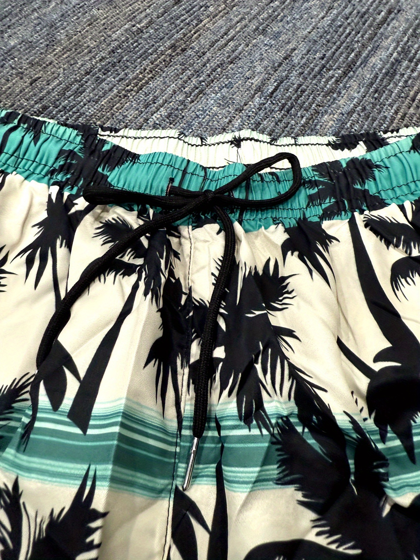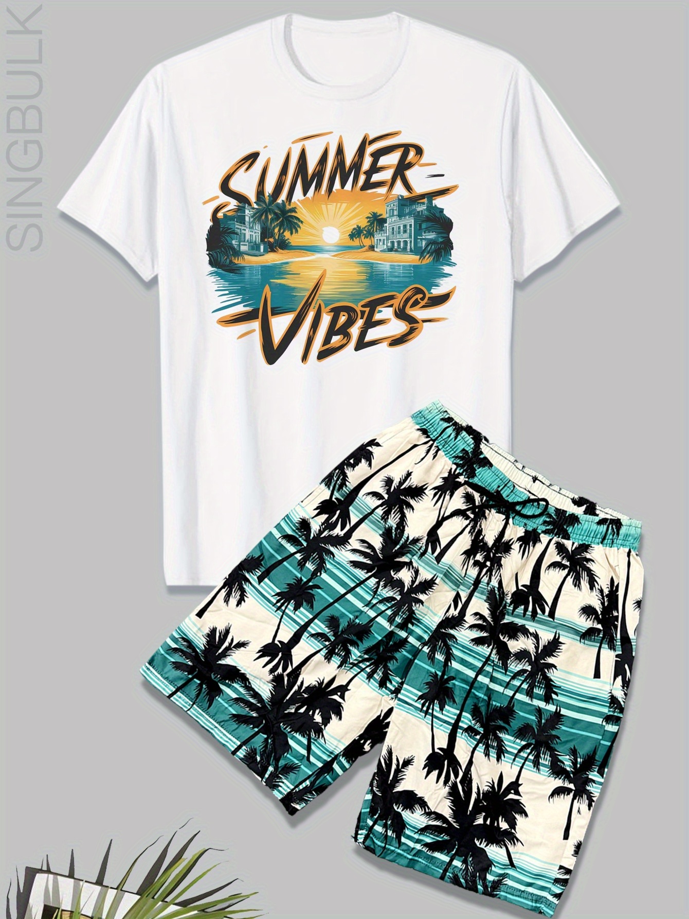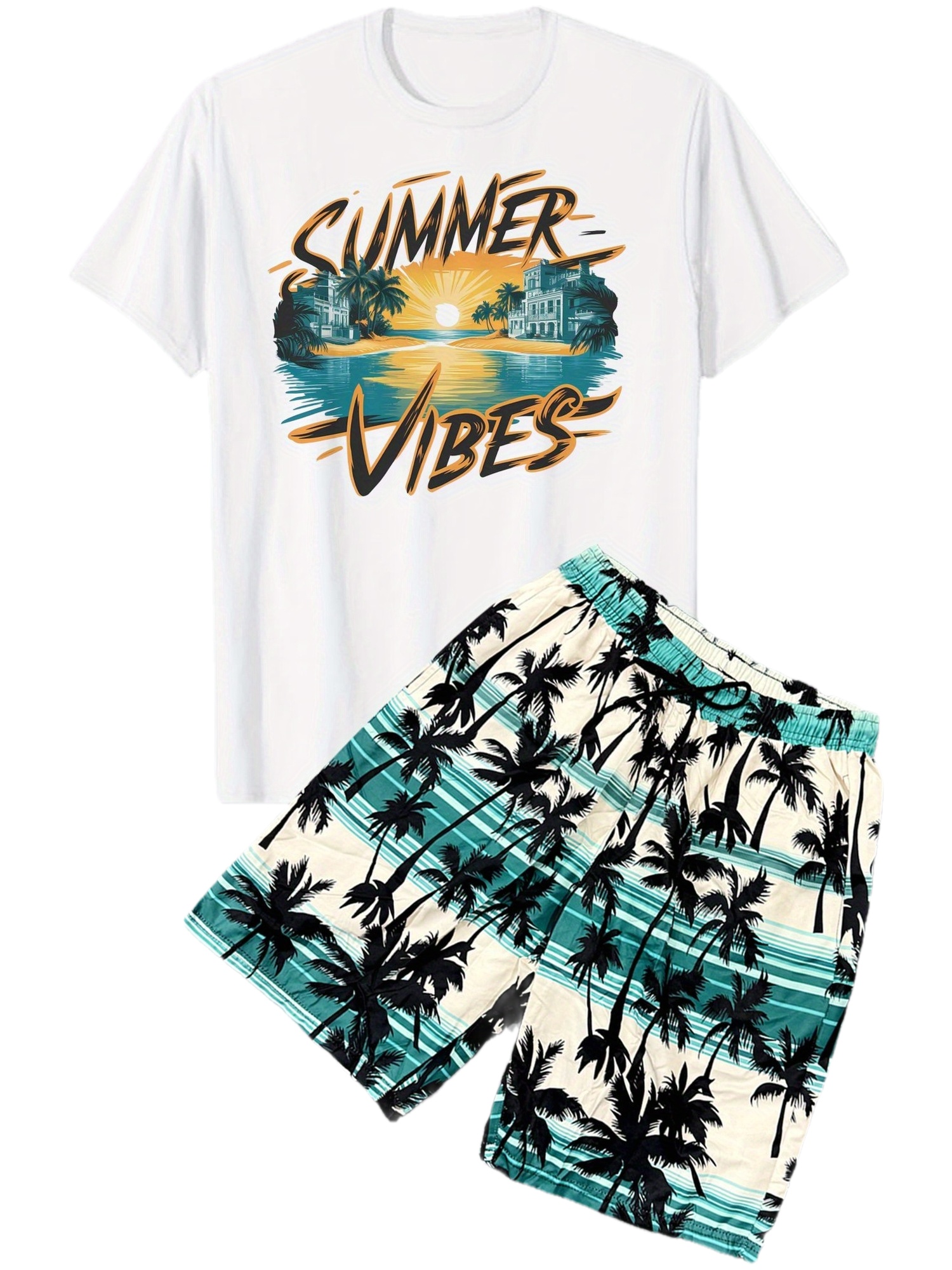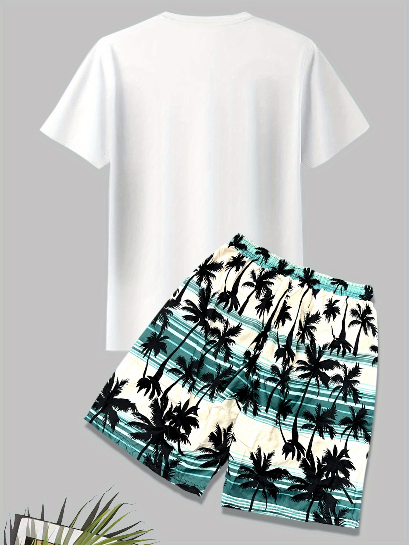 Palm Trees Print Men’s Two-Piece Set Trendy Casual Round Neck Short Sleeve Cotton T-Shirt and Drawstring Shorts Sports Suit Men’s Print Clothing Outdoor Sports Fashion Short Sleeve T-Shirt and Shorts Set