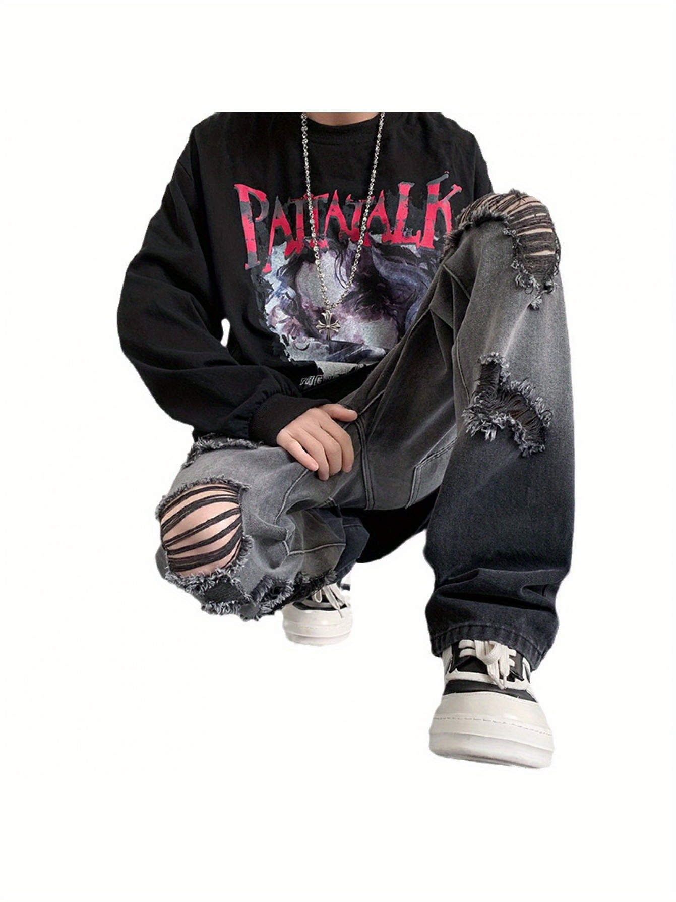 Stylish Gradient Black And Gray Ripped Jeans for Men, Inspired by High Street American Hip Hop, Featuring a Cool High-End Straight-Leg Design Suitable for a Trendy Look