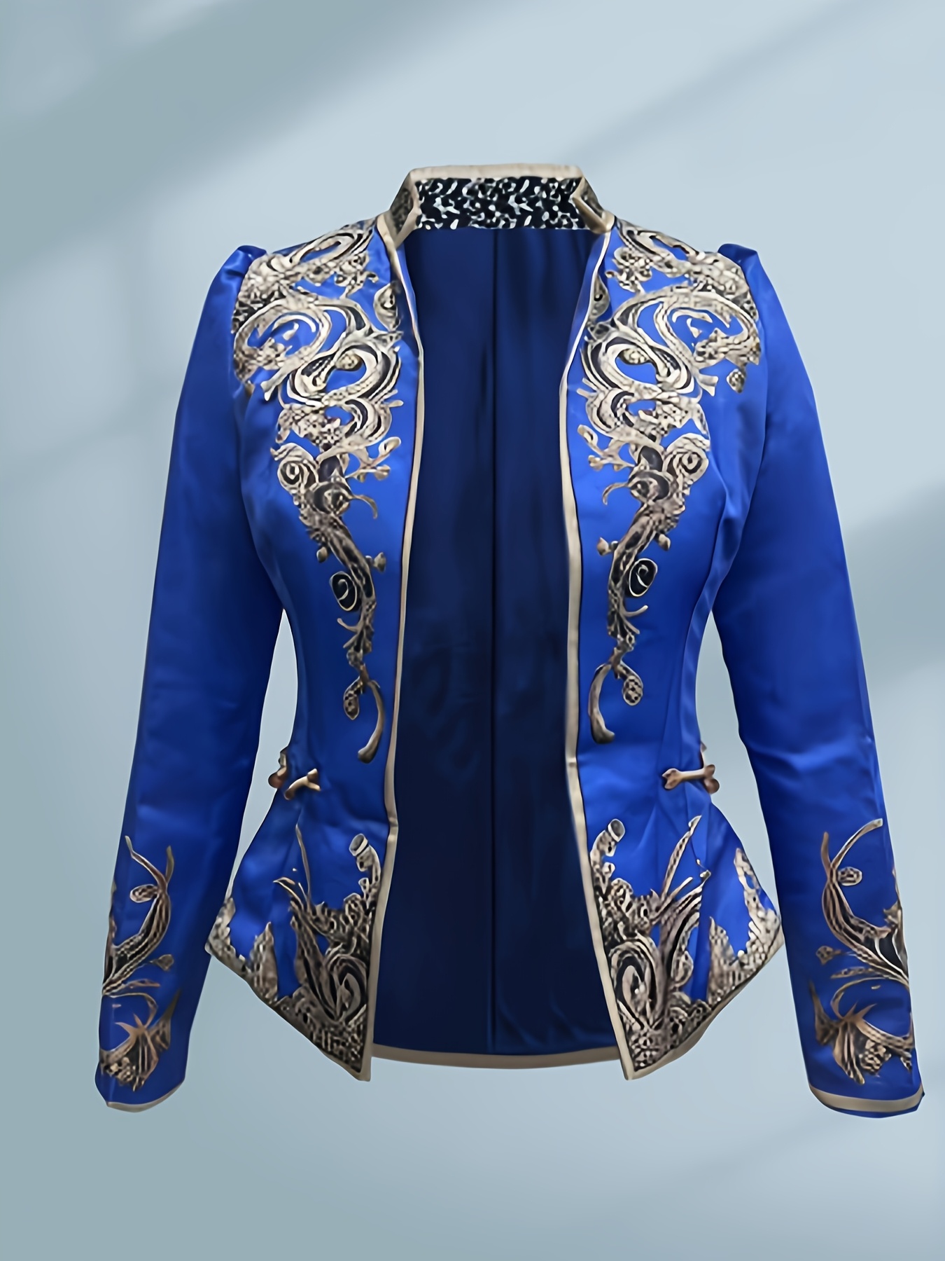 Vintage Floral Stand Collar Long Sleeve Jacket – Blue & Golden Floral Print, Machine Washable Non-Stretch Fabric, A-Line Silhouette for Springu002FFall Casual & Formal Outfits