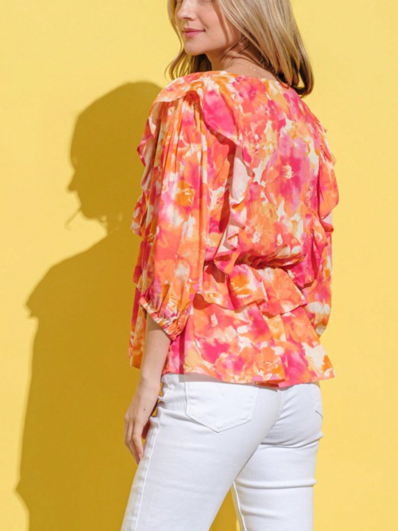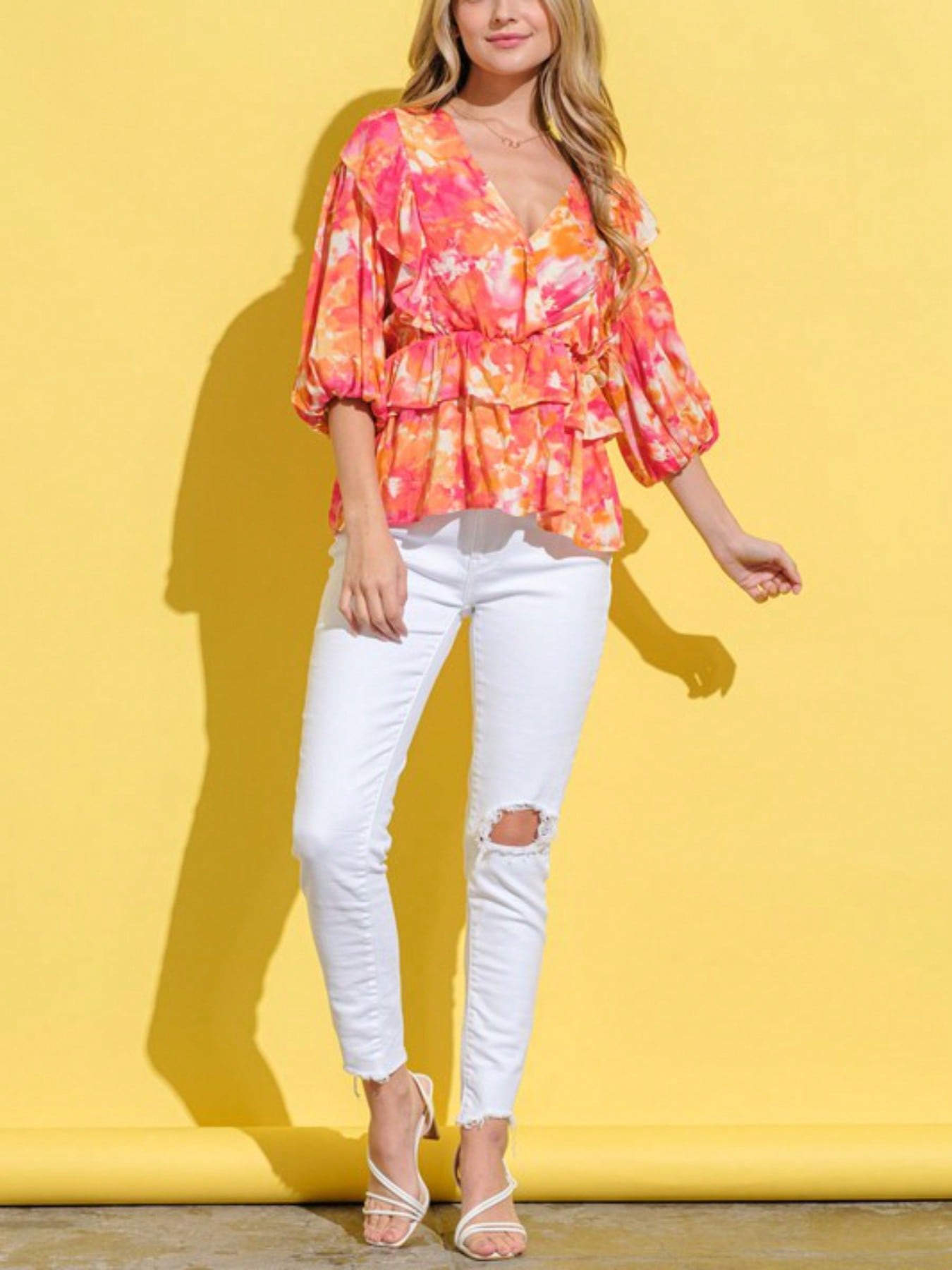 A ruffled printed puff sleeve blouse top is a fashionable and trendy piece that combines several popular design elements. The blouse typically features a printed fabric with a pattern or design. ruffled detailing along the neckline or sleeves. and puff sleeves that add volume and drama to the silhouette. This type of blouse is great for adding a touch of whimsy and femininity to your outfit and can be dressed up or down depending on your styling preferences.