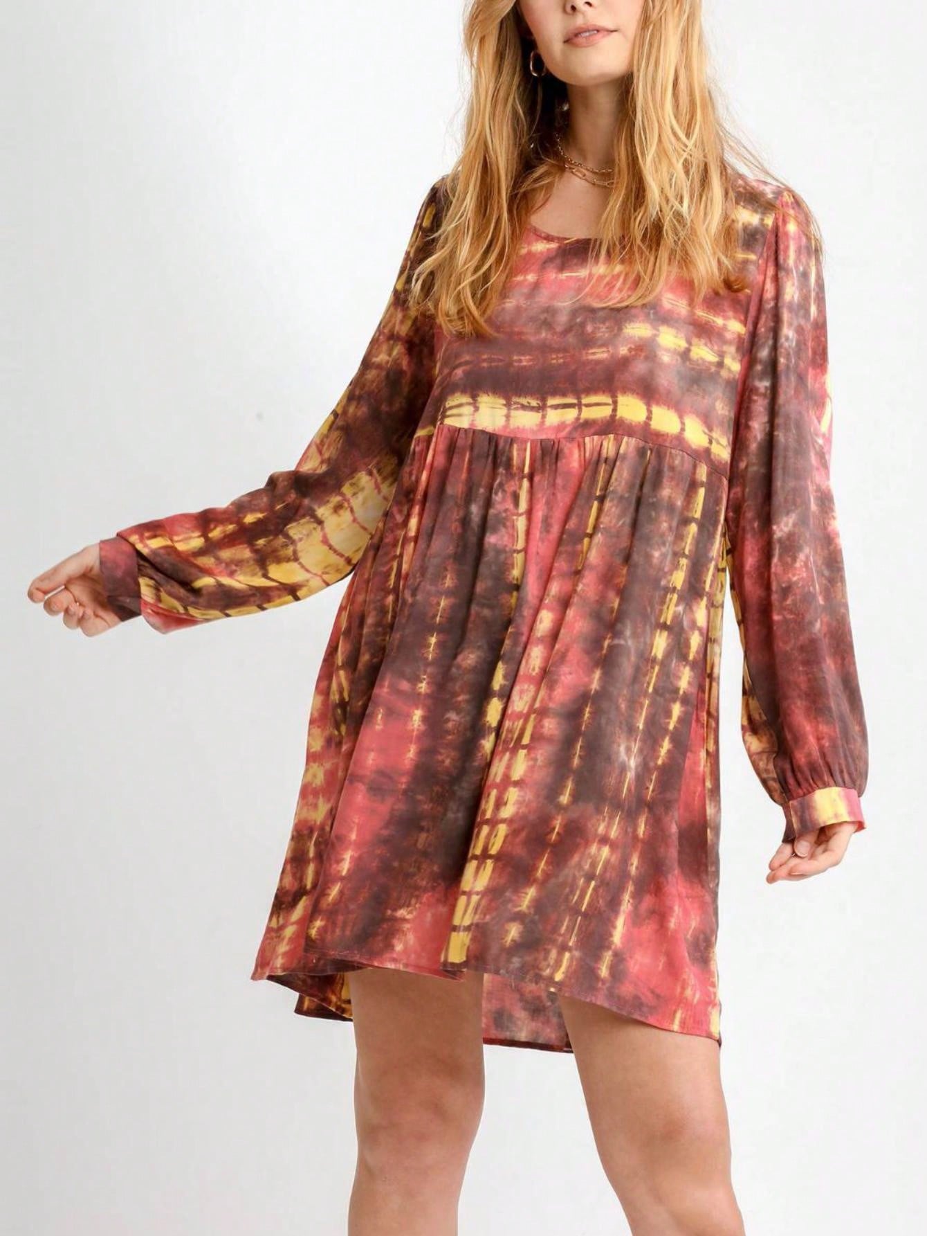 Womens Casual Boho Chic Tie Dye Pattern Empire Waist Babydoll Mini Dress Yellow Brown Pink Long Balloon Sleeve Round Neck Loose Flowy Fall Spring Daily Wear