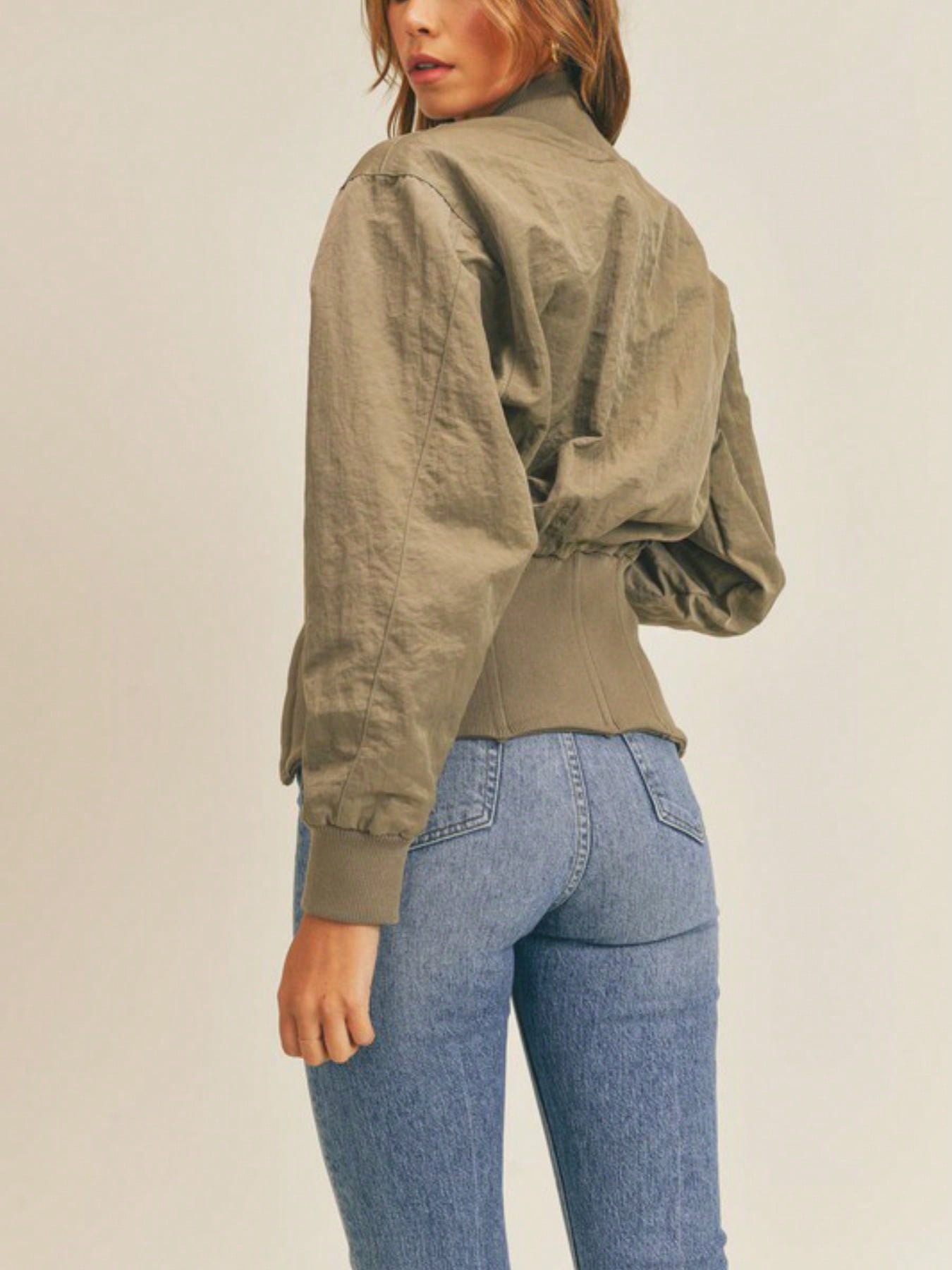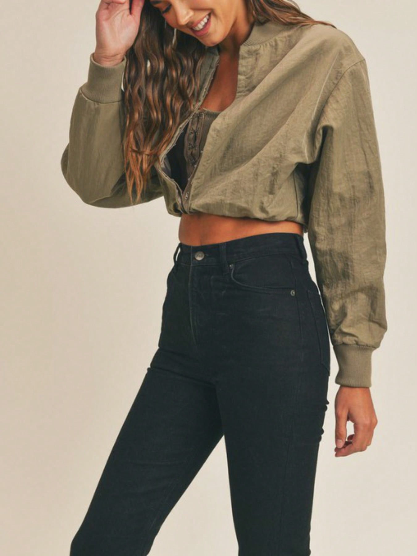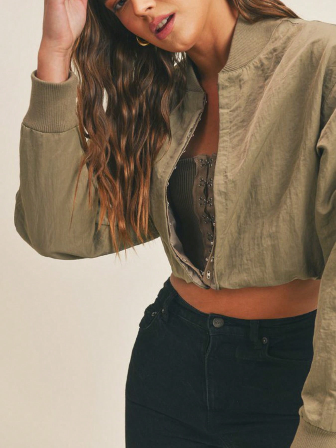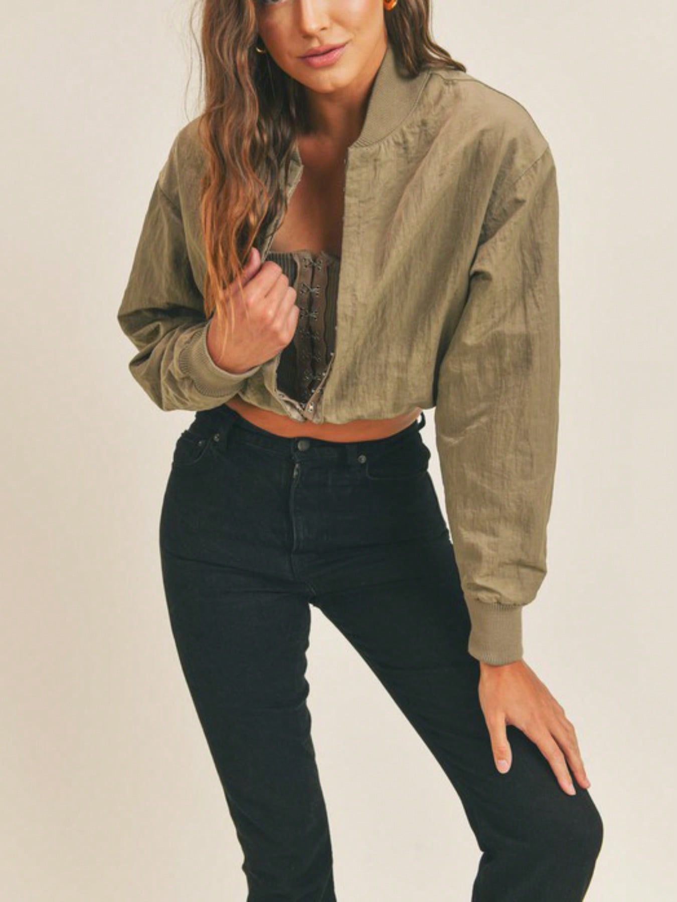 Womens Casual Bomber Chic Cropped Zip Up Baseball Jacket Lightweight Stand Collar Long Sleeve Olive Green Relaxed Fit Spring Fall Streetwear Fashion Forward Outerwear Layer Daily Wear