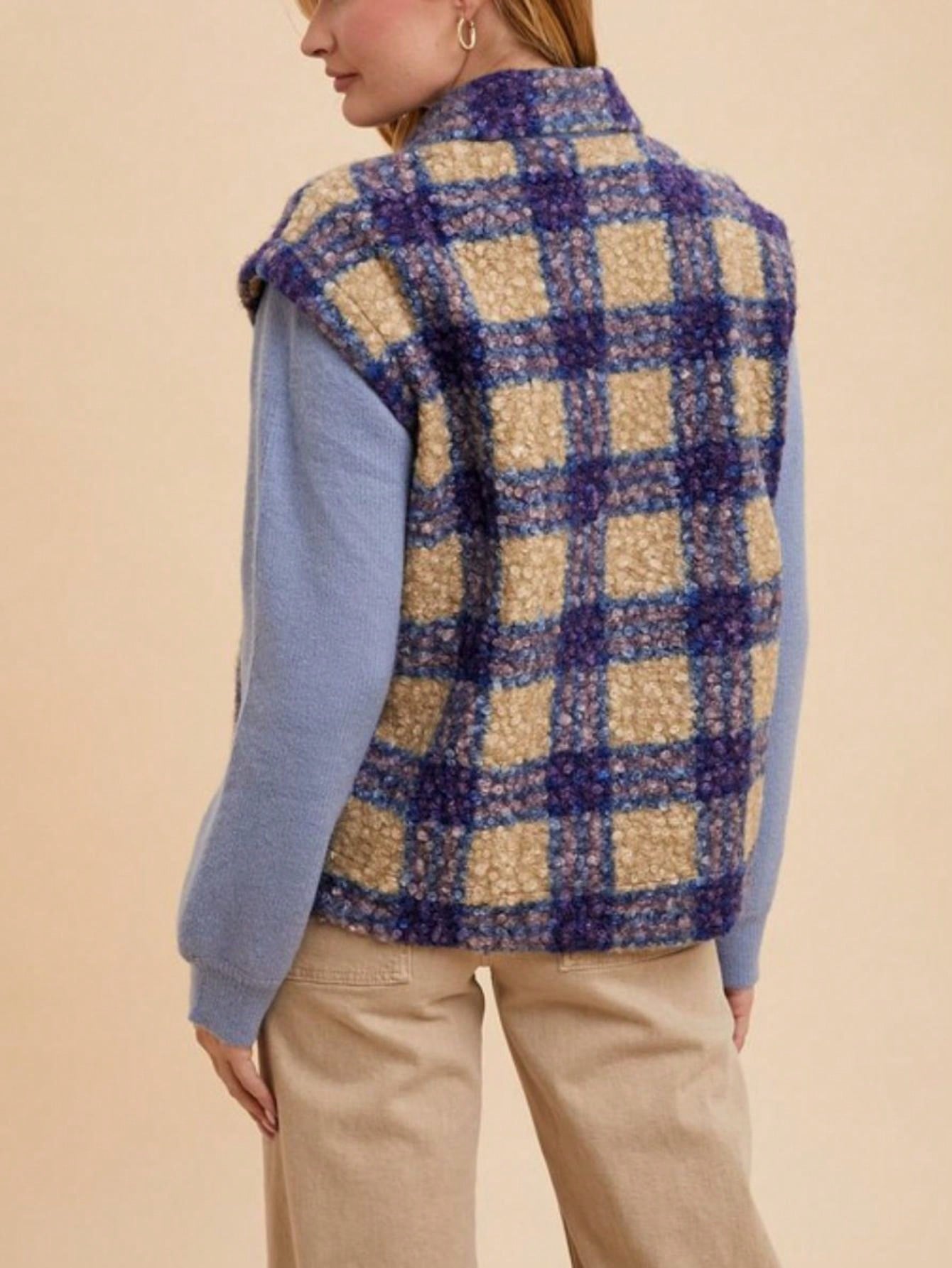 A faux fur plaid button-up jacket is a stylish and cozy outerwear piece that combines trendy elements for a fashion-forward look. The faux fur adds a touch of luxury and warmth to the jacket. creating a chic and glamorous vibe. The plaid pattern adds a classic and timeless touch to the overall design. offering a versatile option for different outfit pairings. This type of jacket can be a statement piece in your wardrobe. perfect for adding texture and dimension to your outfits.