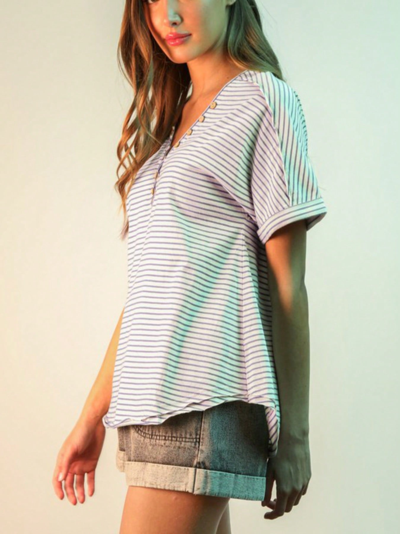 Womens Casual T Shirt Relaxed Fit Nautical Striped Henley Top Button Front V Neck Short Sleeve Oversized Slouchy Basic Everyday Tee Navy White Summer Lightweight Breathable Beach Weekend Blouse