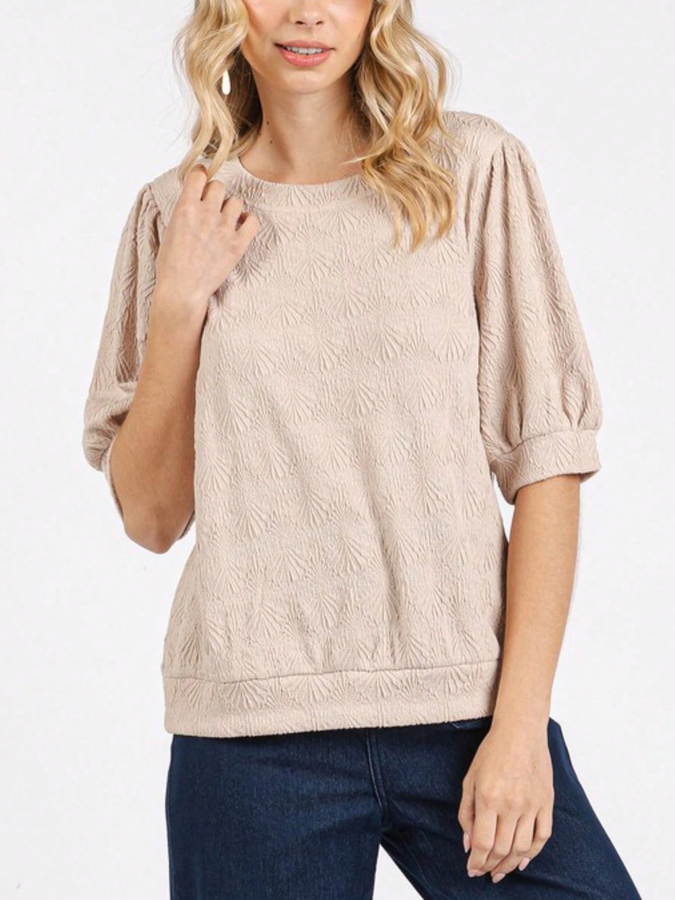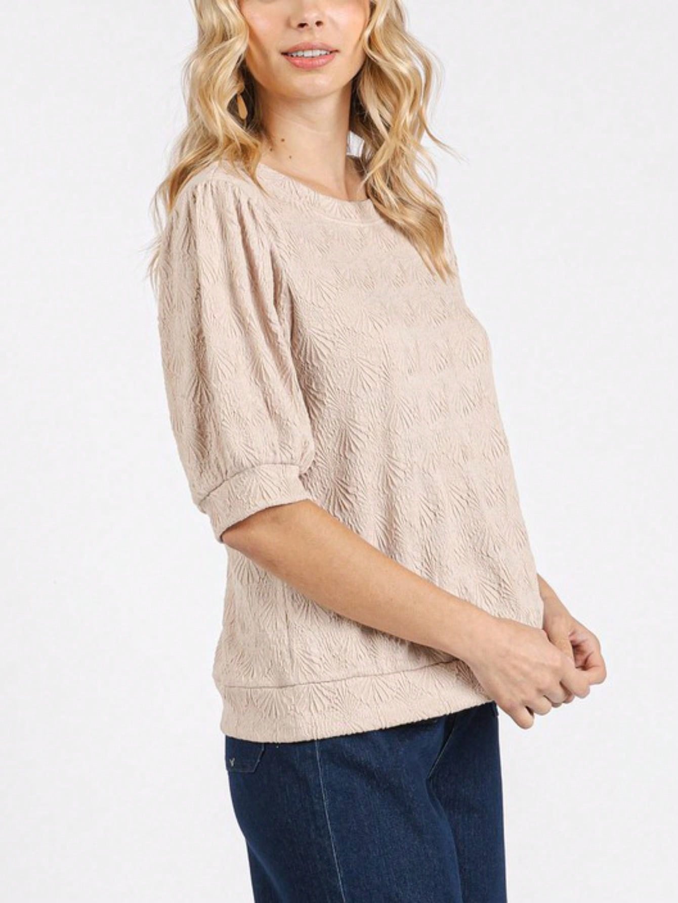 Womens Casual Textured Chic Elegant Embossed Fan Pattern Balloon Sleeve Blouse Beige Three Quarter Length Sleeve Round Neck Structured Top Perfect for Office Daily Wear Spring Summer