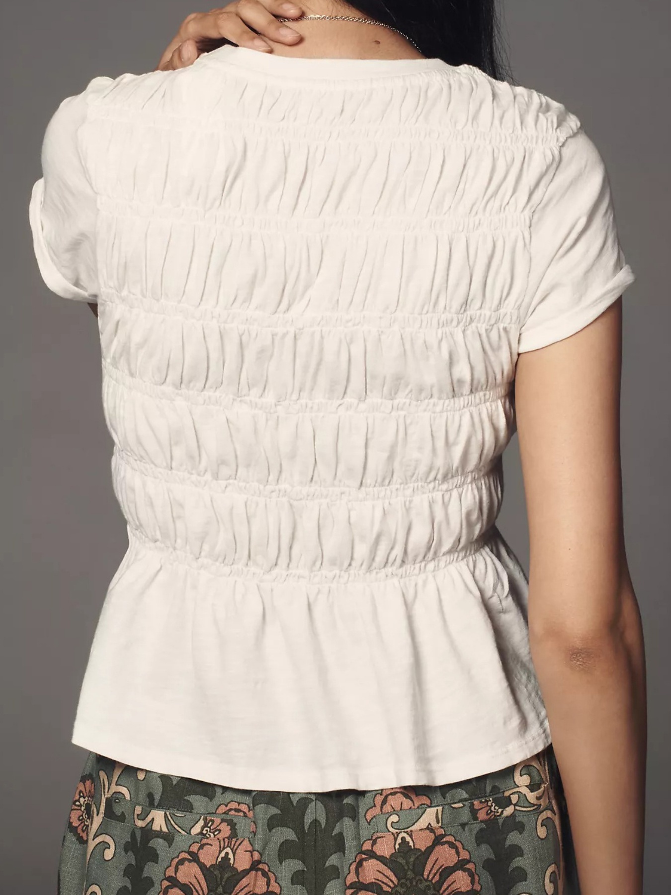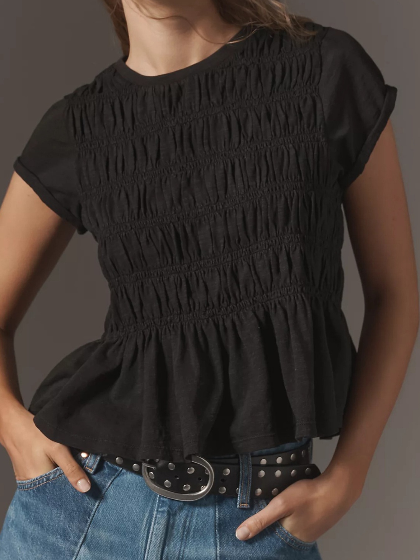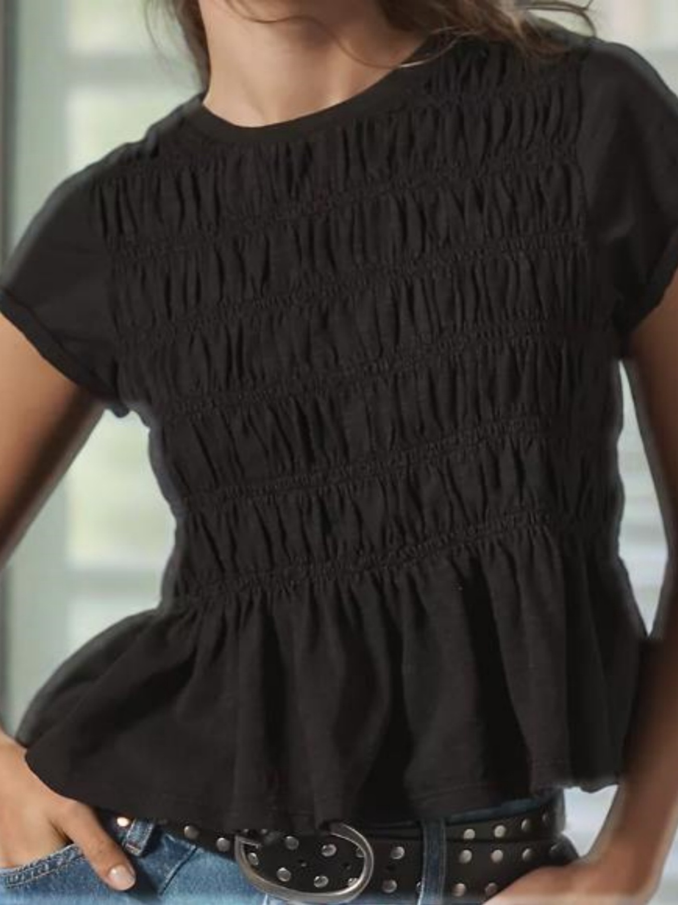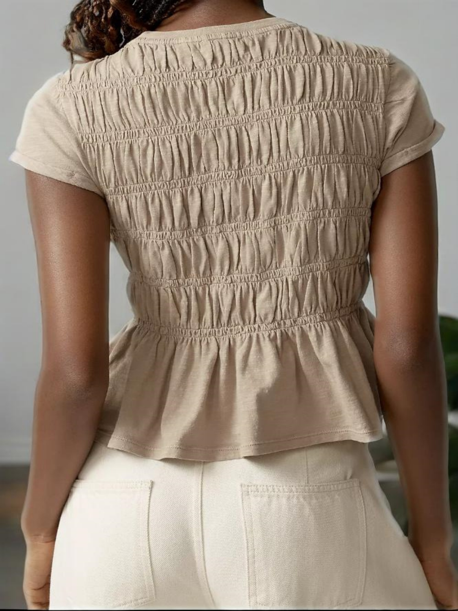 Women’s Elegant Smocked Summer Short Sleeve Top – Slim Fit Ruffle Hem & Cap Sleeve Blouse with Shirred Neckline, Round Neck Casual to Semi-Formal Shirt, Machine Washable Solid Color Going Out Blouse