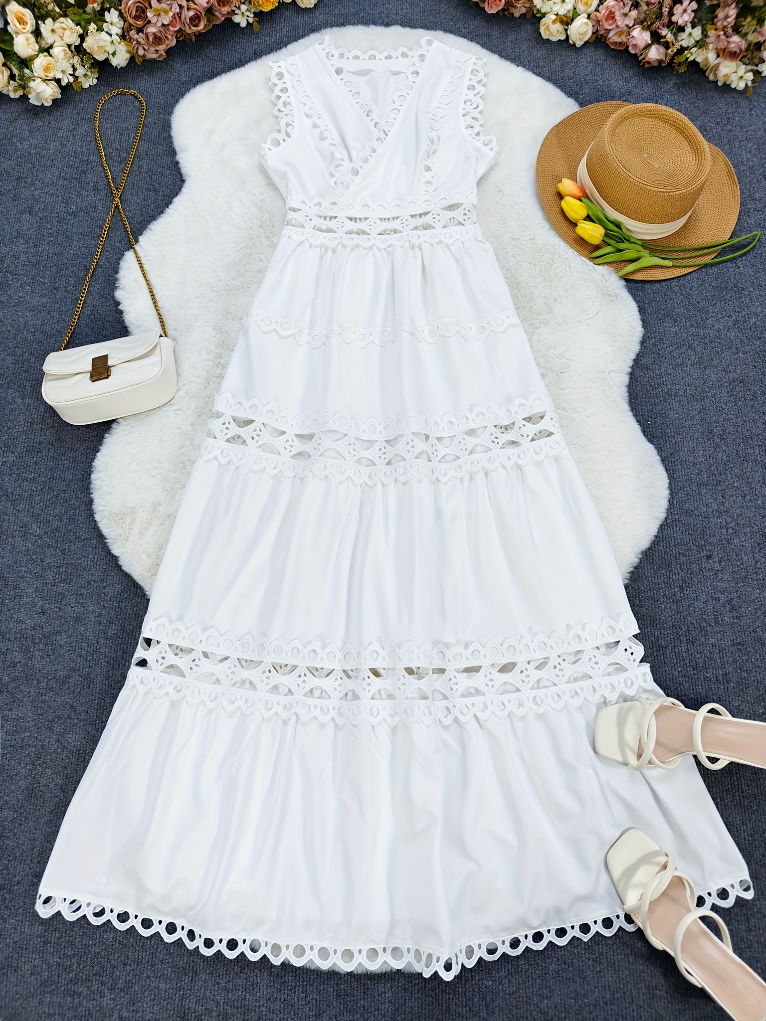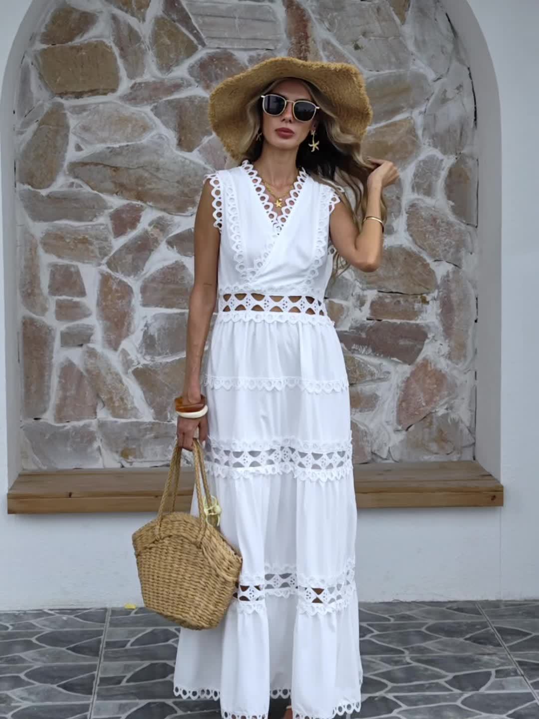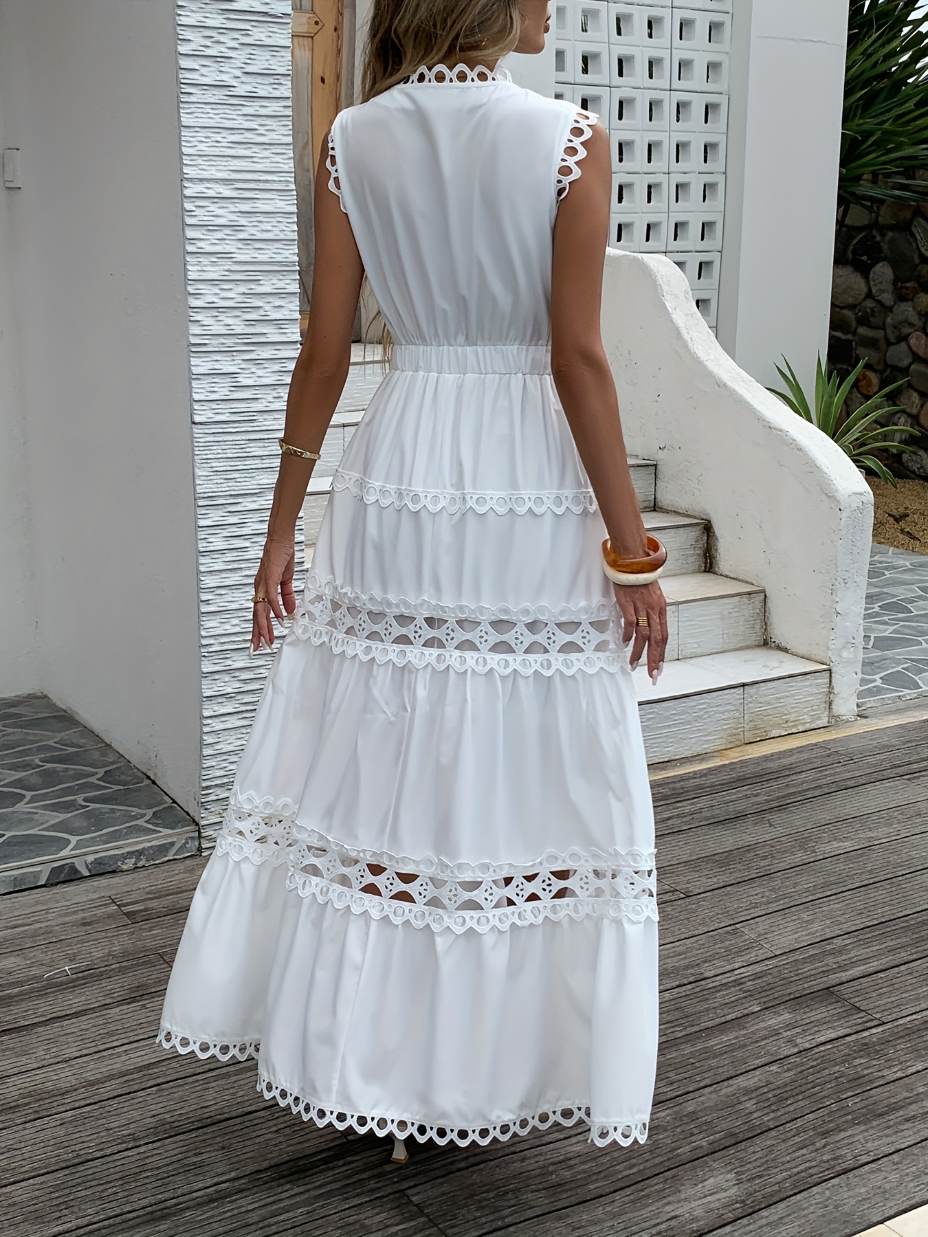Women’S Elegant V-Neck Ruffle Dress – Solid Color, Sleeveless A-Line Midi Dress with Lace Detailing, Perfect for Vacation and Casual Attire, Casual Attire|Vneck Dress|Lace Detailing