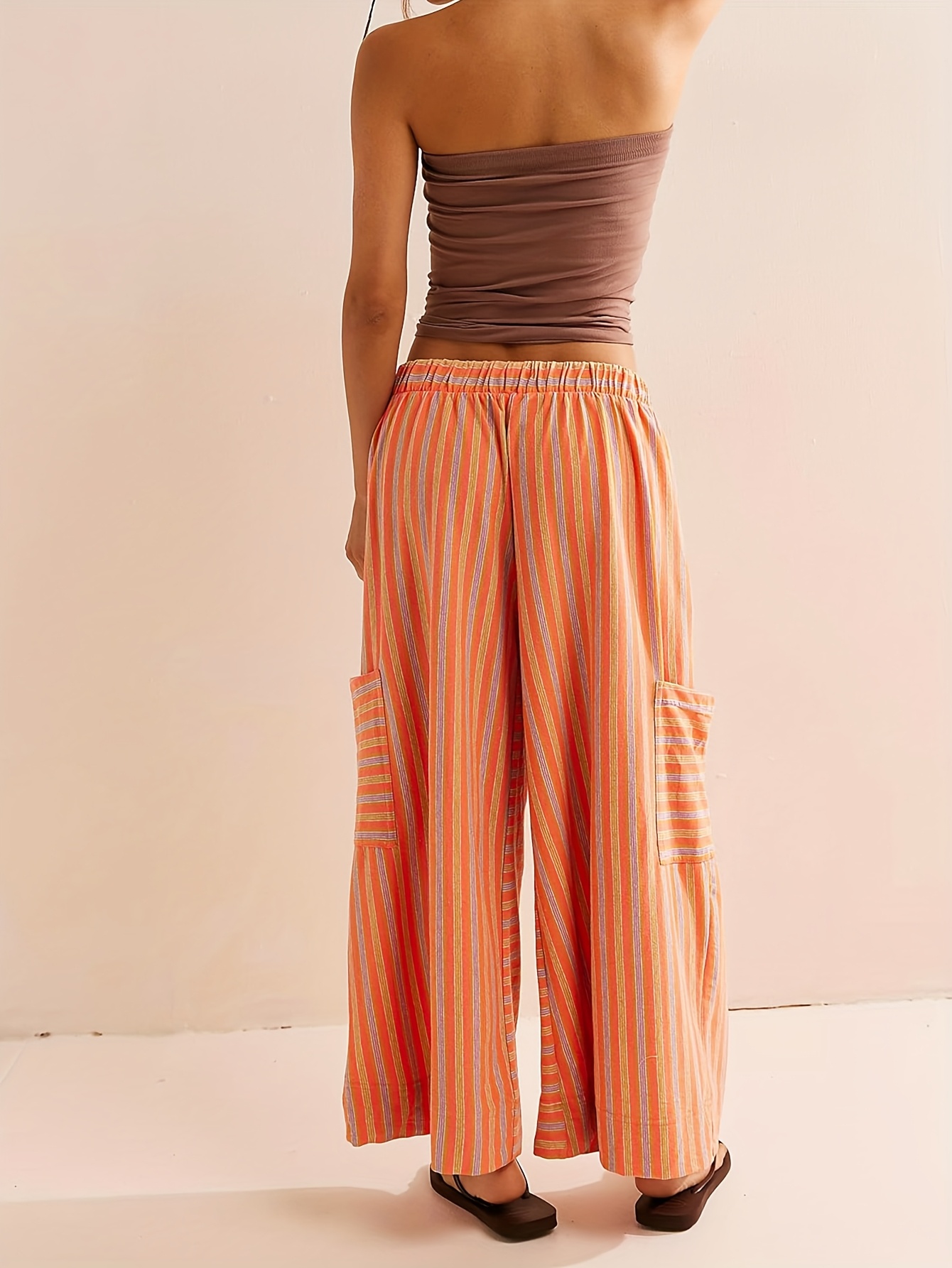 Women’s Lightweight Loose Wide Leg Palazzo Pants – Casual Elastic Drawstring Waist with Dropped Pockets, Green & White Striped 100% Polyester Trousers for Springu002FSummer Outings, Spring Attire, Fashionforward Look, Comfortable Fit