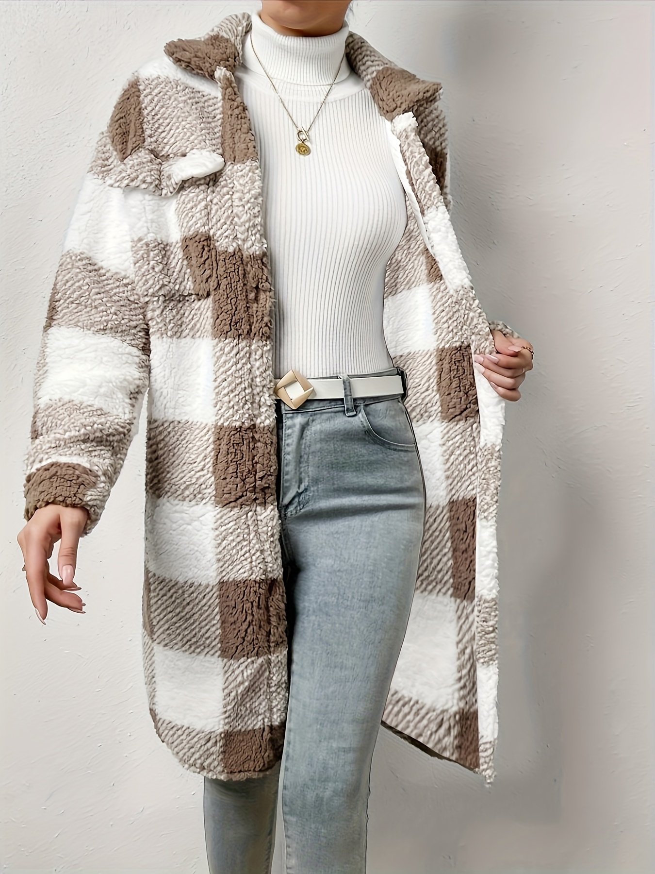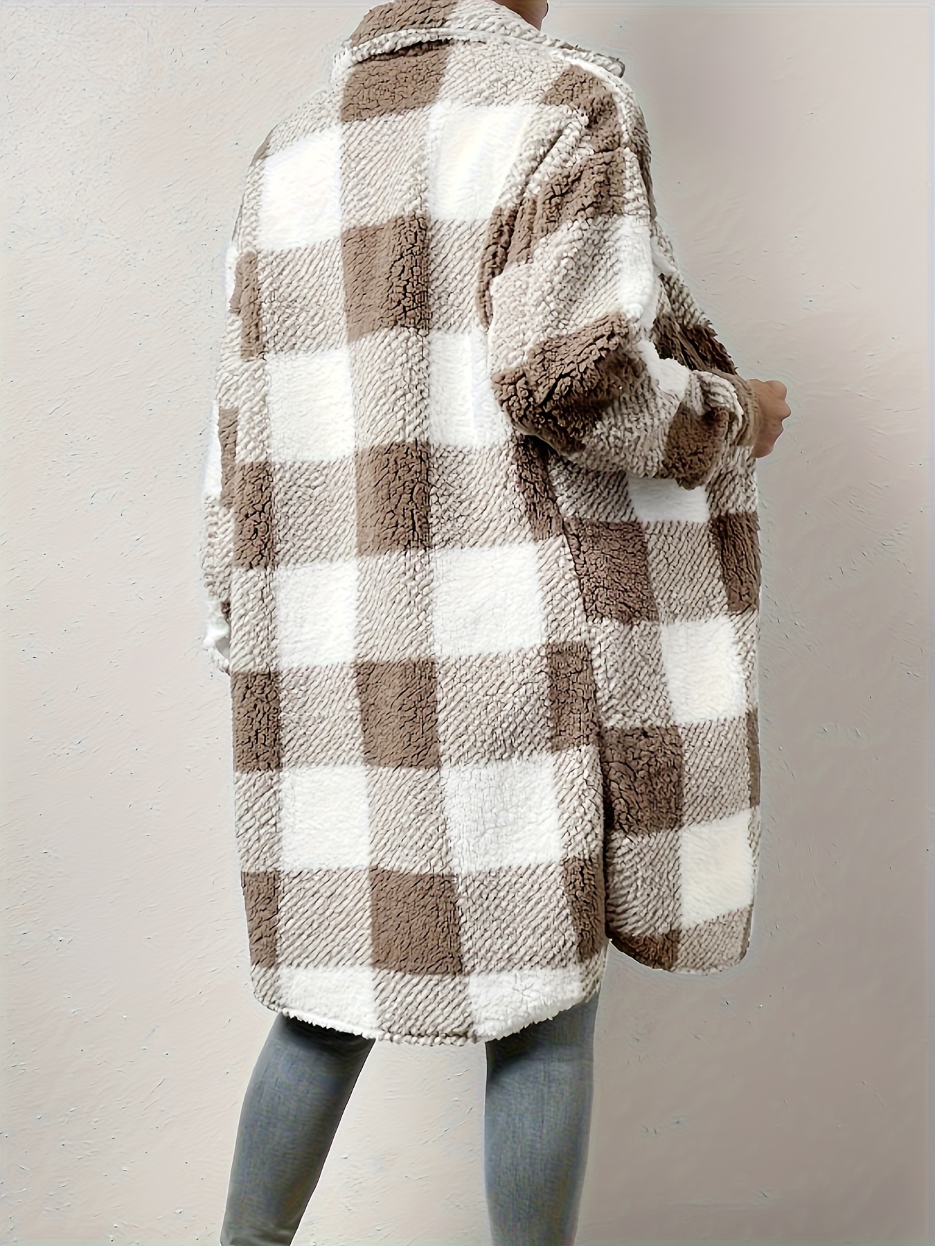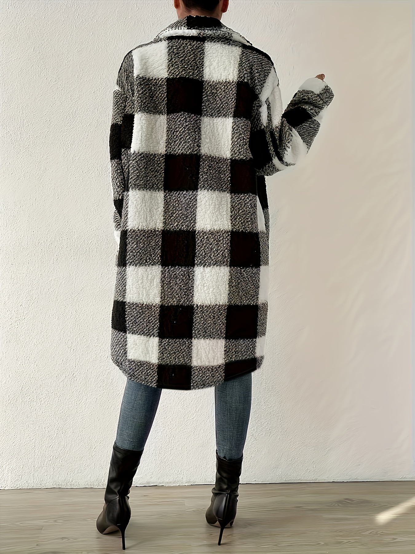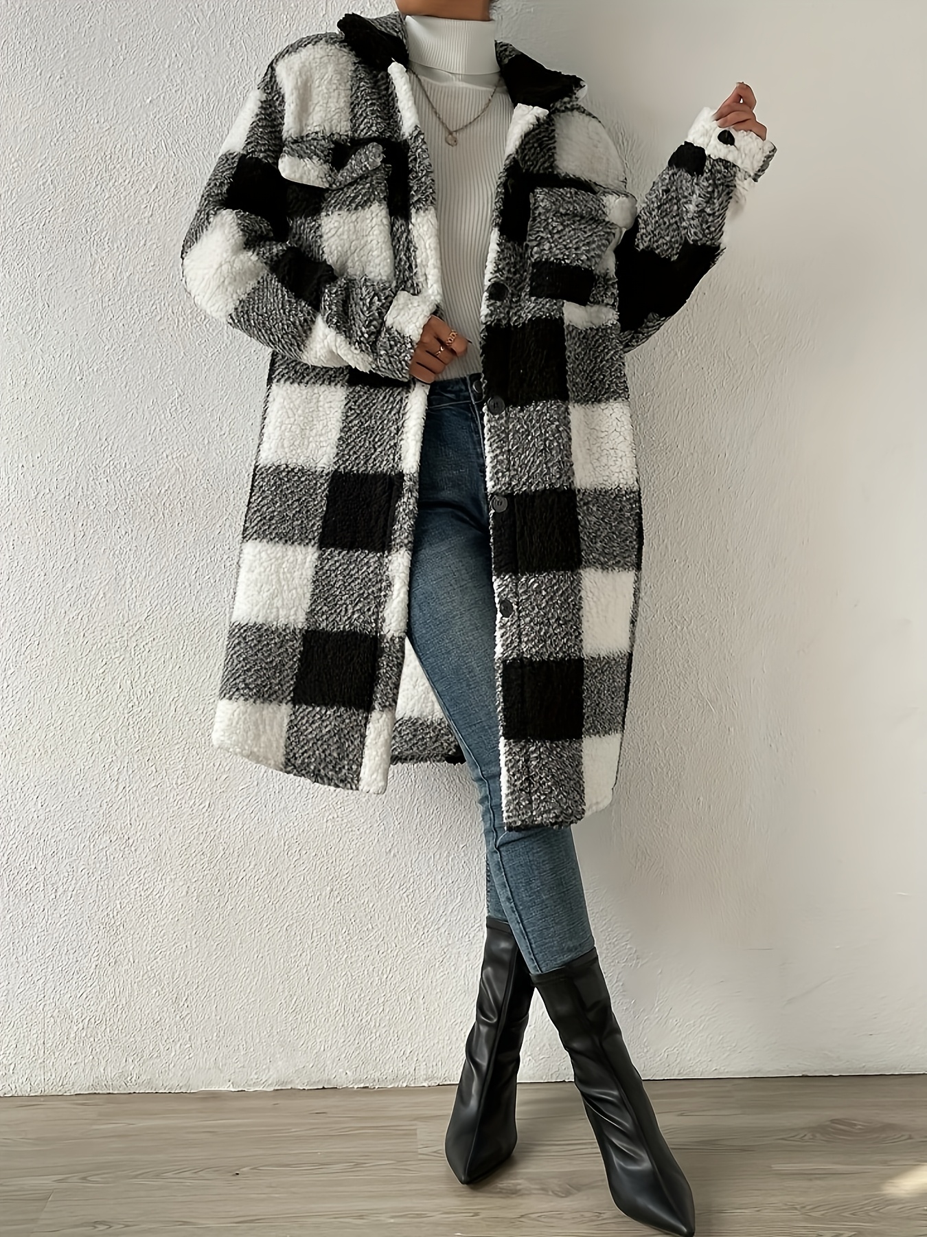 Women’S Long Sleeve Plaid Coat Windbreaker – Black & White Checkered Pattern, Cozy Fleece-Lined Winter Jacket with Pockets, Casual Style for Cold Weather, Cozy Winter Wear | Checkered Pattern Coat | Functional Pockets