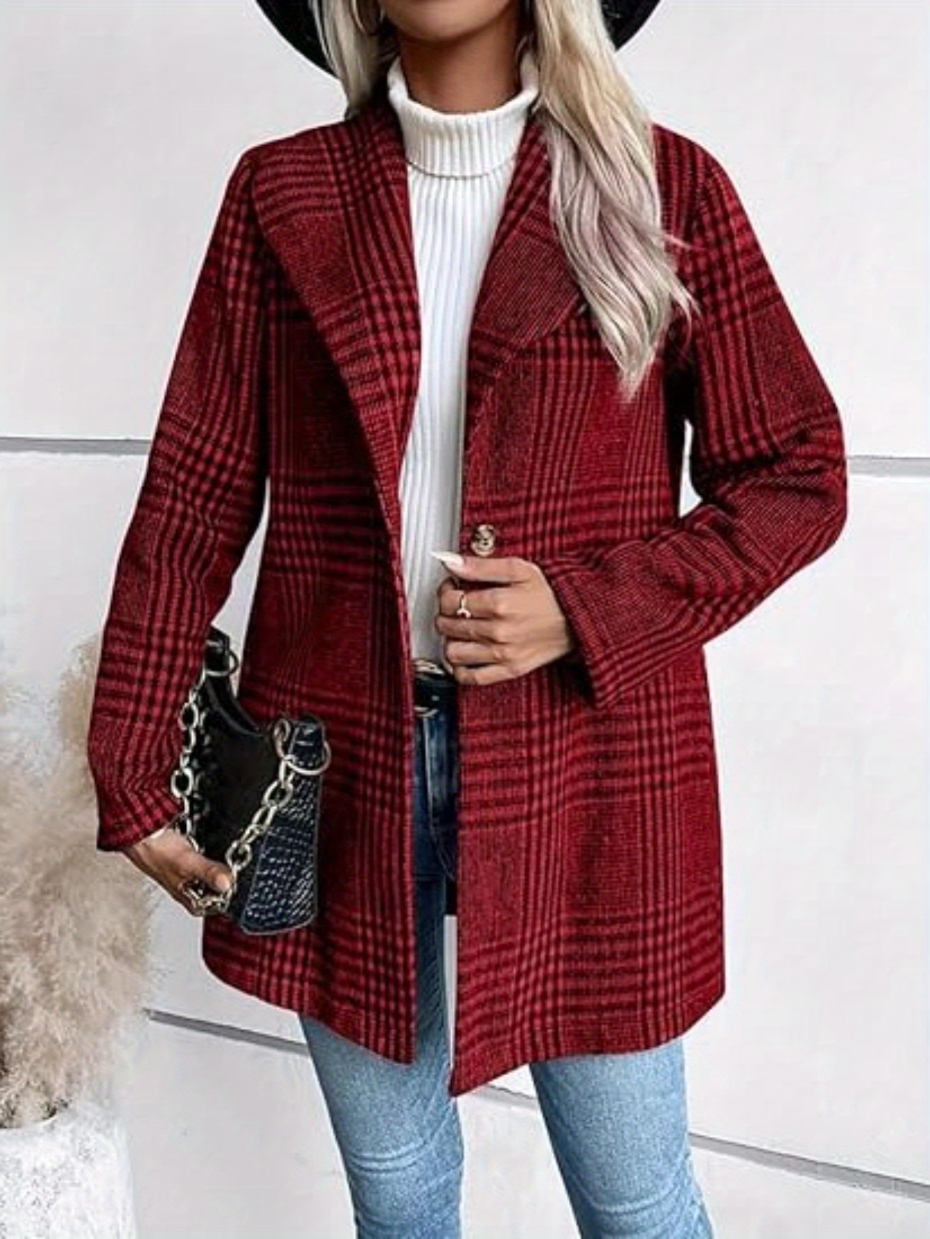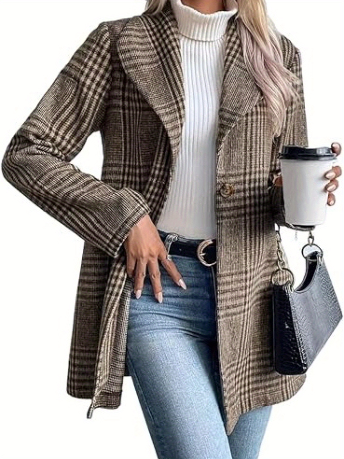 Women’S Slim Fit Plaid Coat – Casual Long Sleeve Button-Up with Lapel Collar, Brown & White Checkered Pattern, Perfect for Fallu002FWinter, Stylish Outerwear | Checkered Pattern Coat | Buttonup Coat