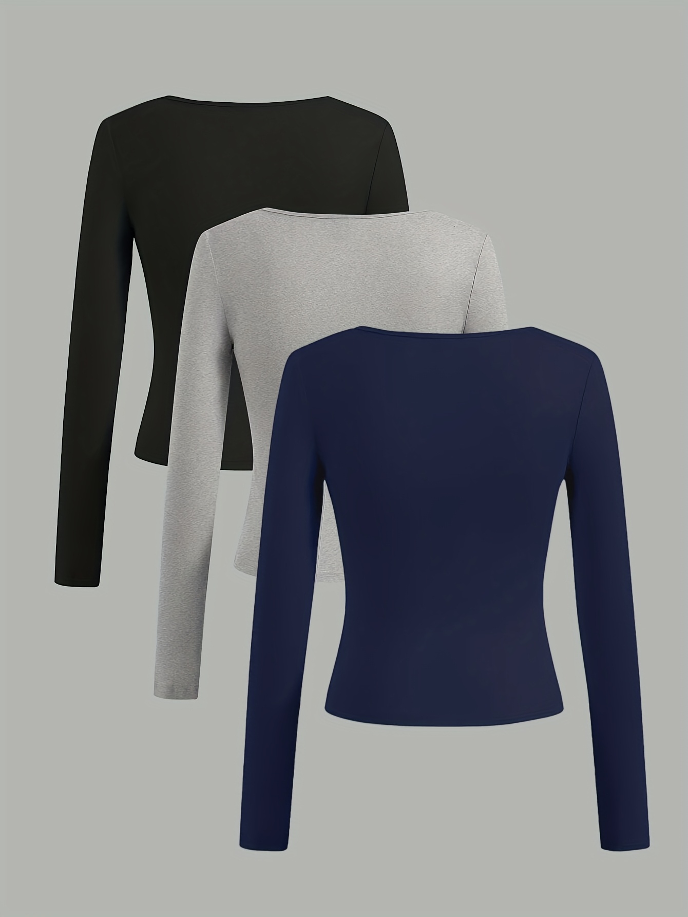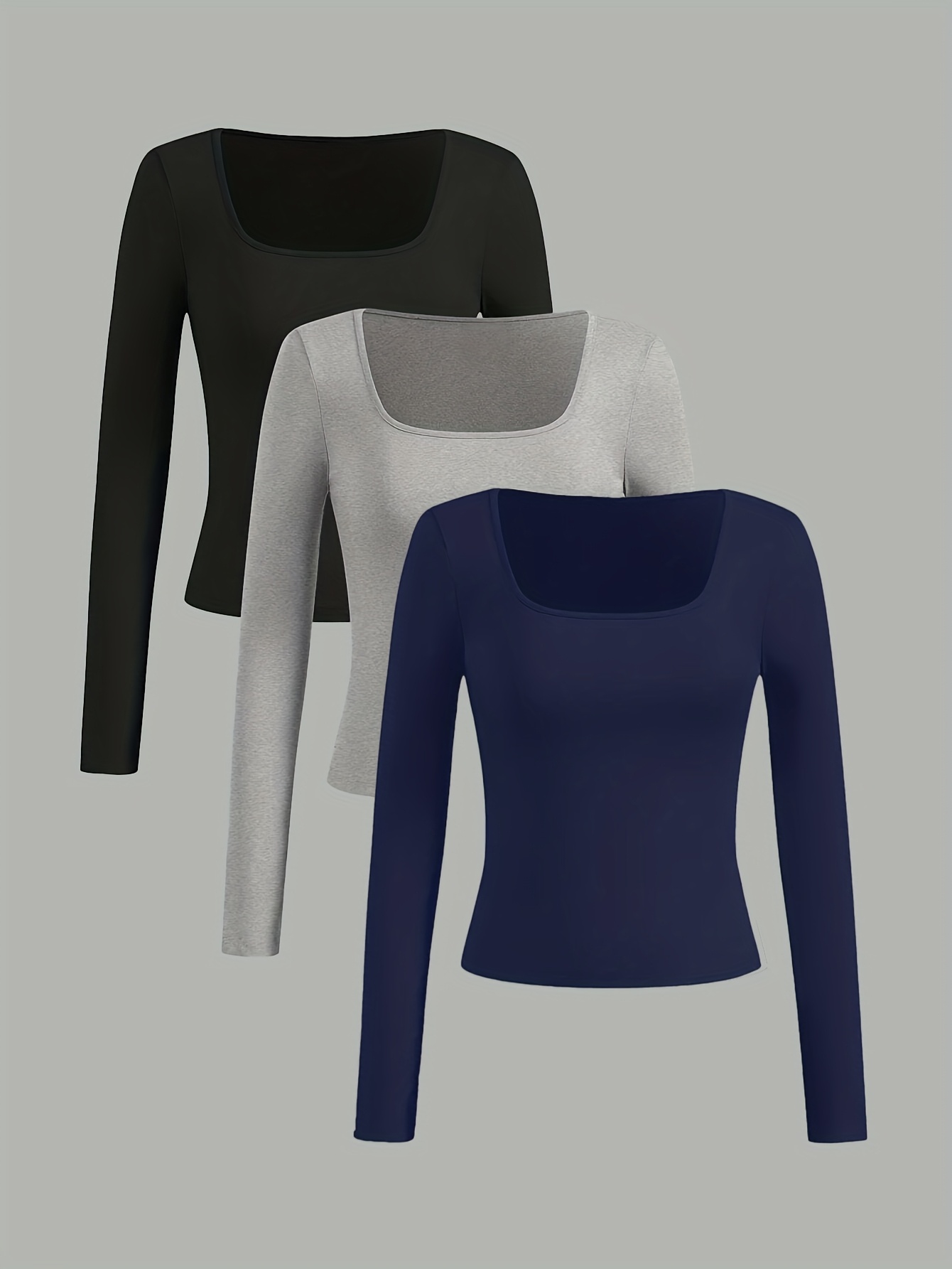 Women’S Spring and Autumn Classic Three-Color Square Neck Long Sleeve, Simple Fashionable Versatile New Style, 3pcs Set