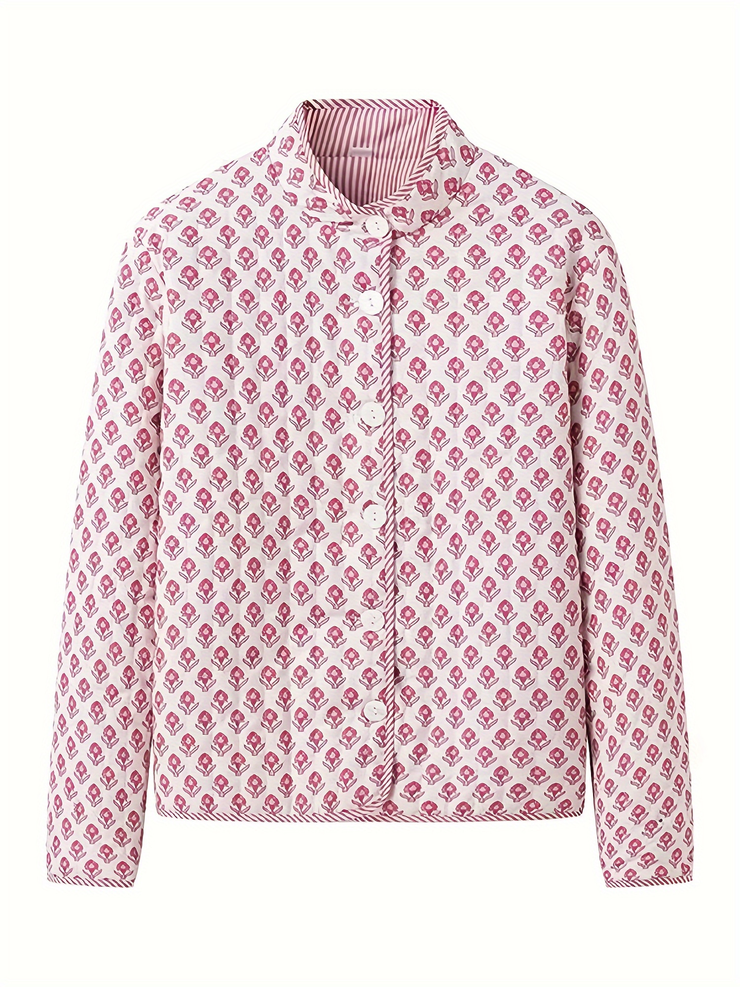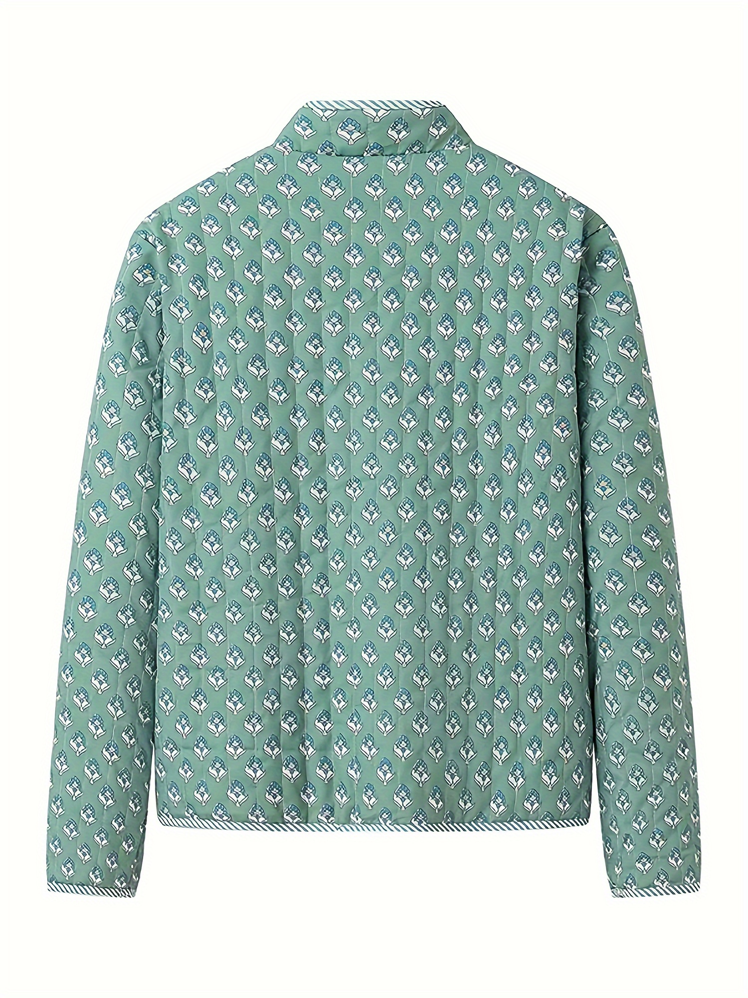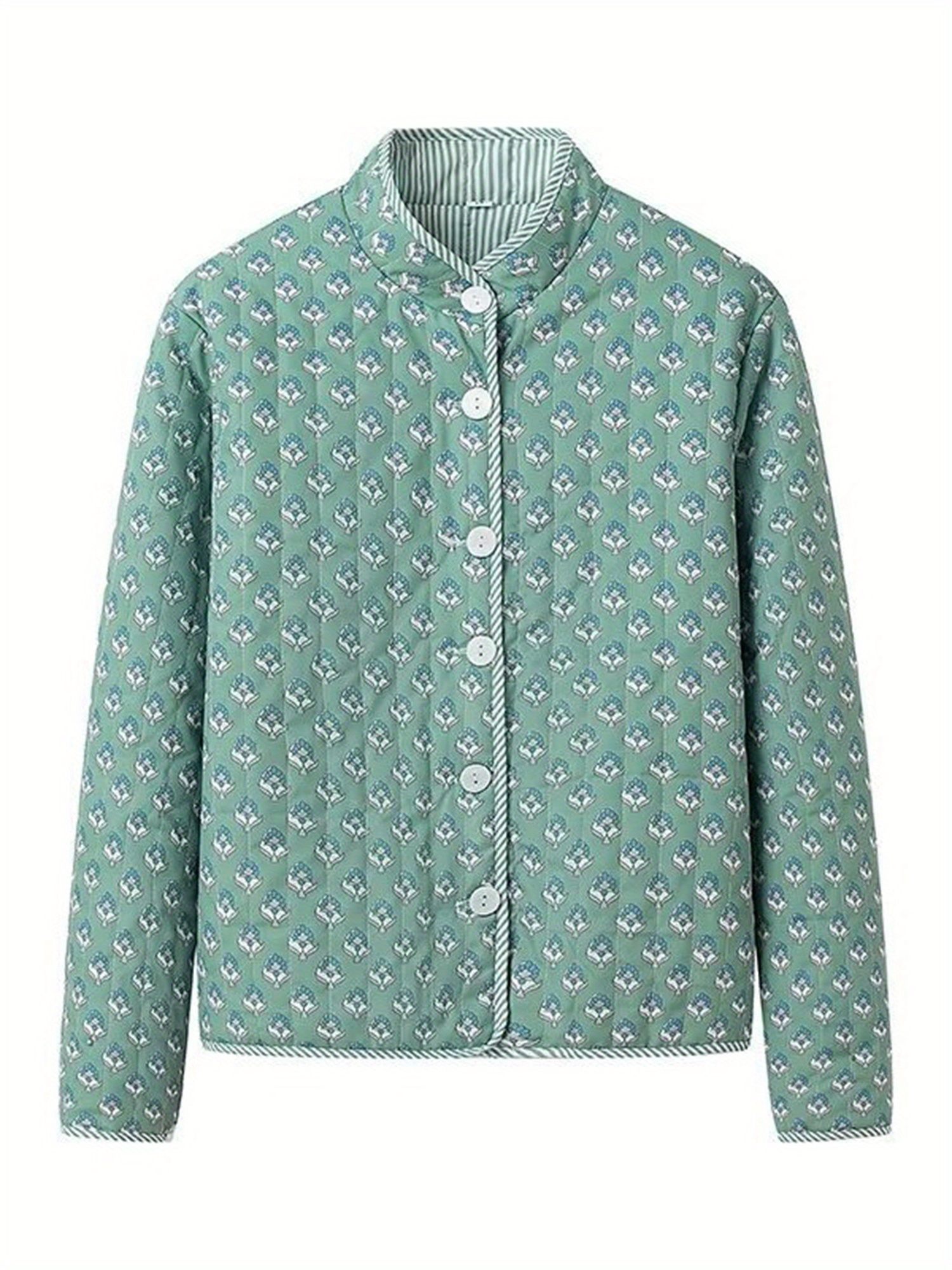 Women’s Y2K Floral Quilted Jacket – Double-Sided Print, Mock Neck, Long Sleeve Button- Coat, Casual Fallu002FWinter Outerwear, Machine Washable, Green & Beige Floral Design, Cute Jacket