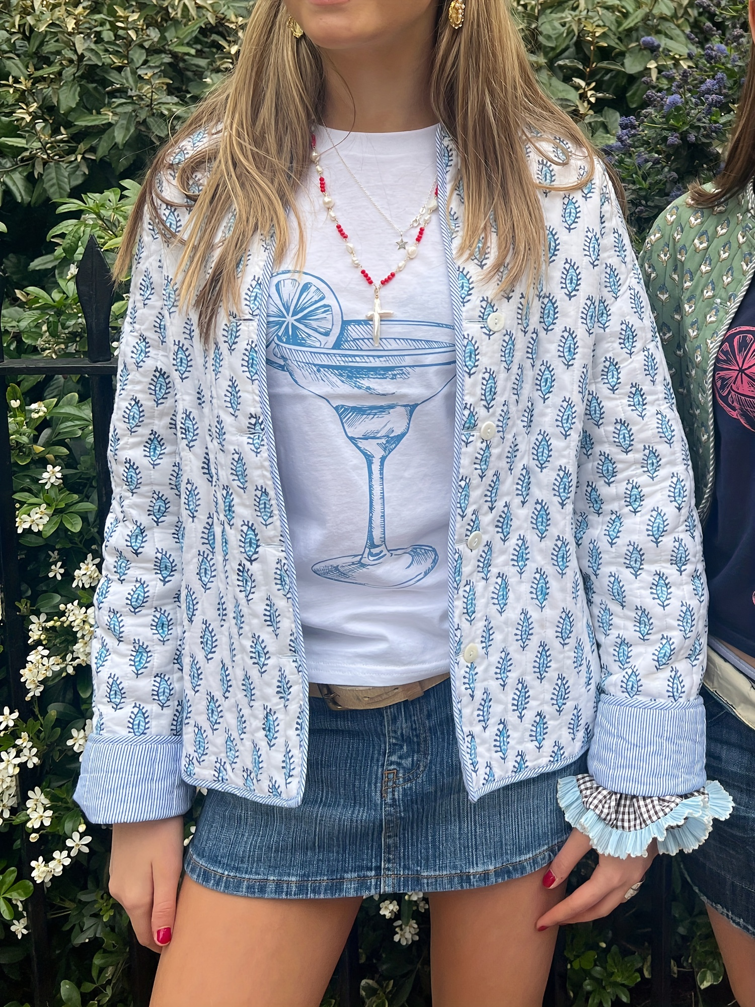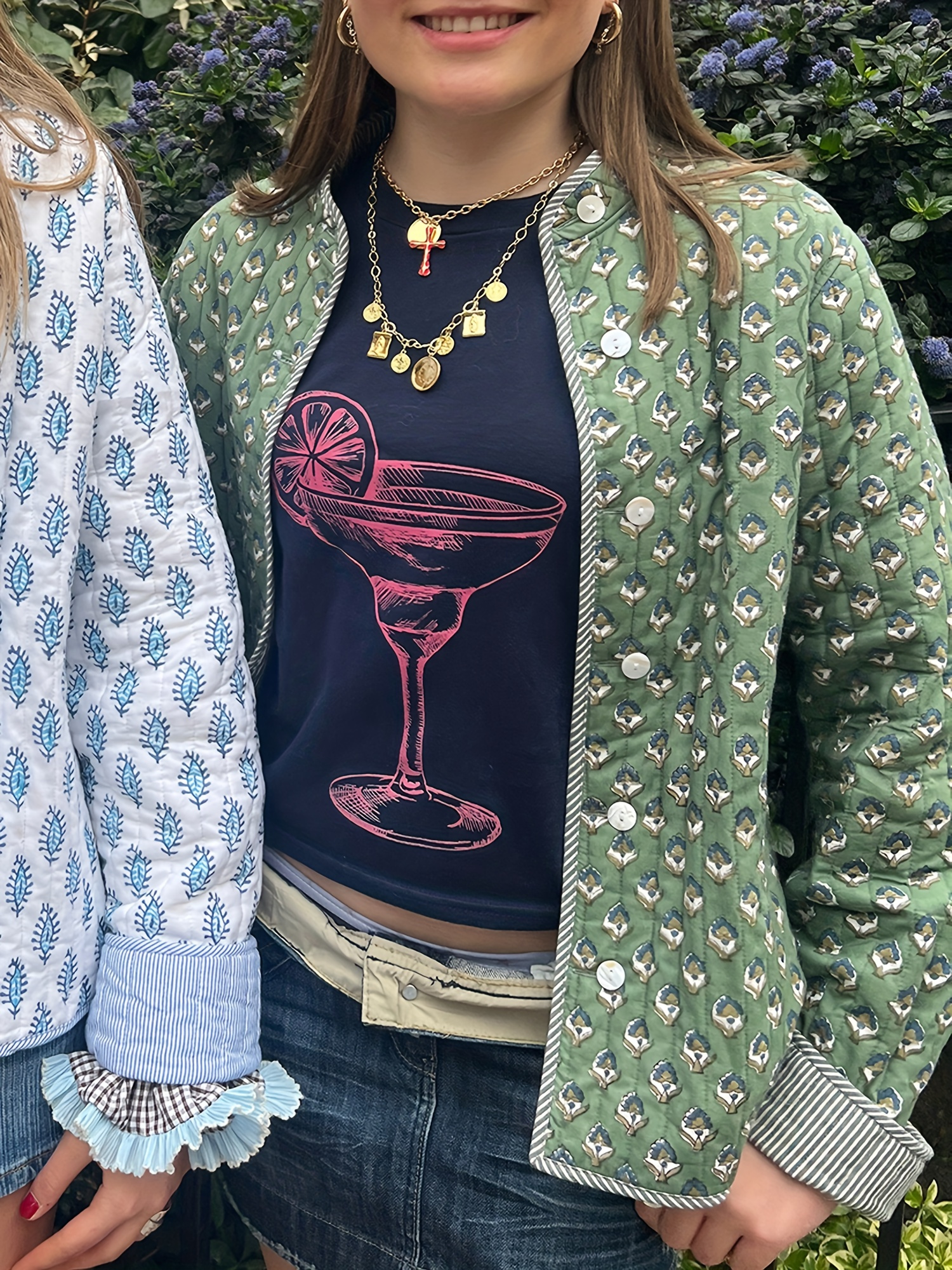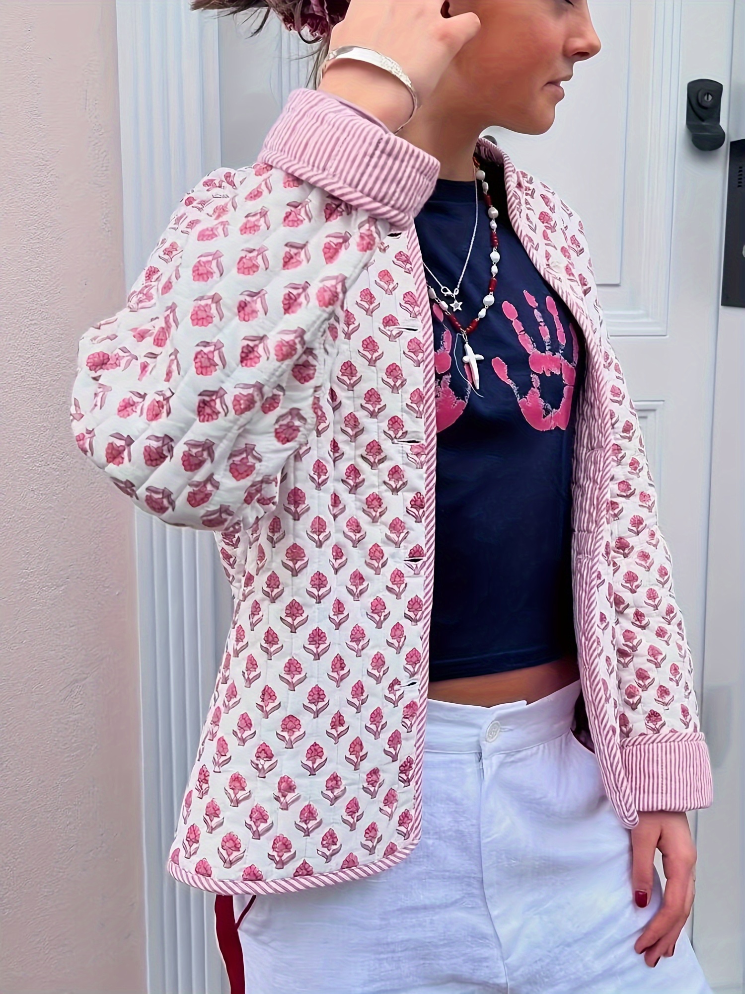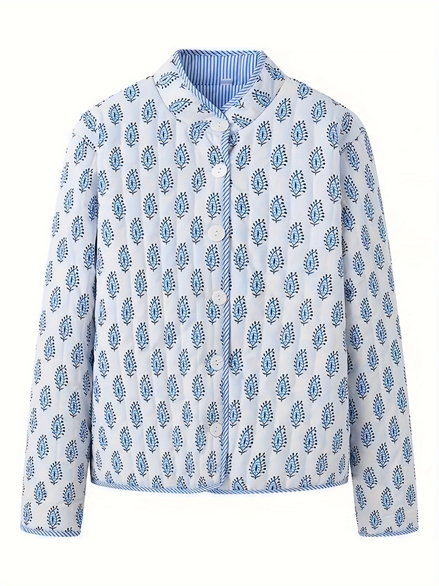 Women’s Y2K Floral Quilted Jacket – Double-Sided Print, Mock Neck, Long Sleeve Button- Coat, Casual Fallu002FWinter Outerwear, Machine Washable, Green & Beige Floral Design, Cute Jacket