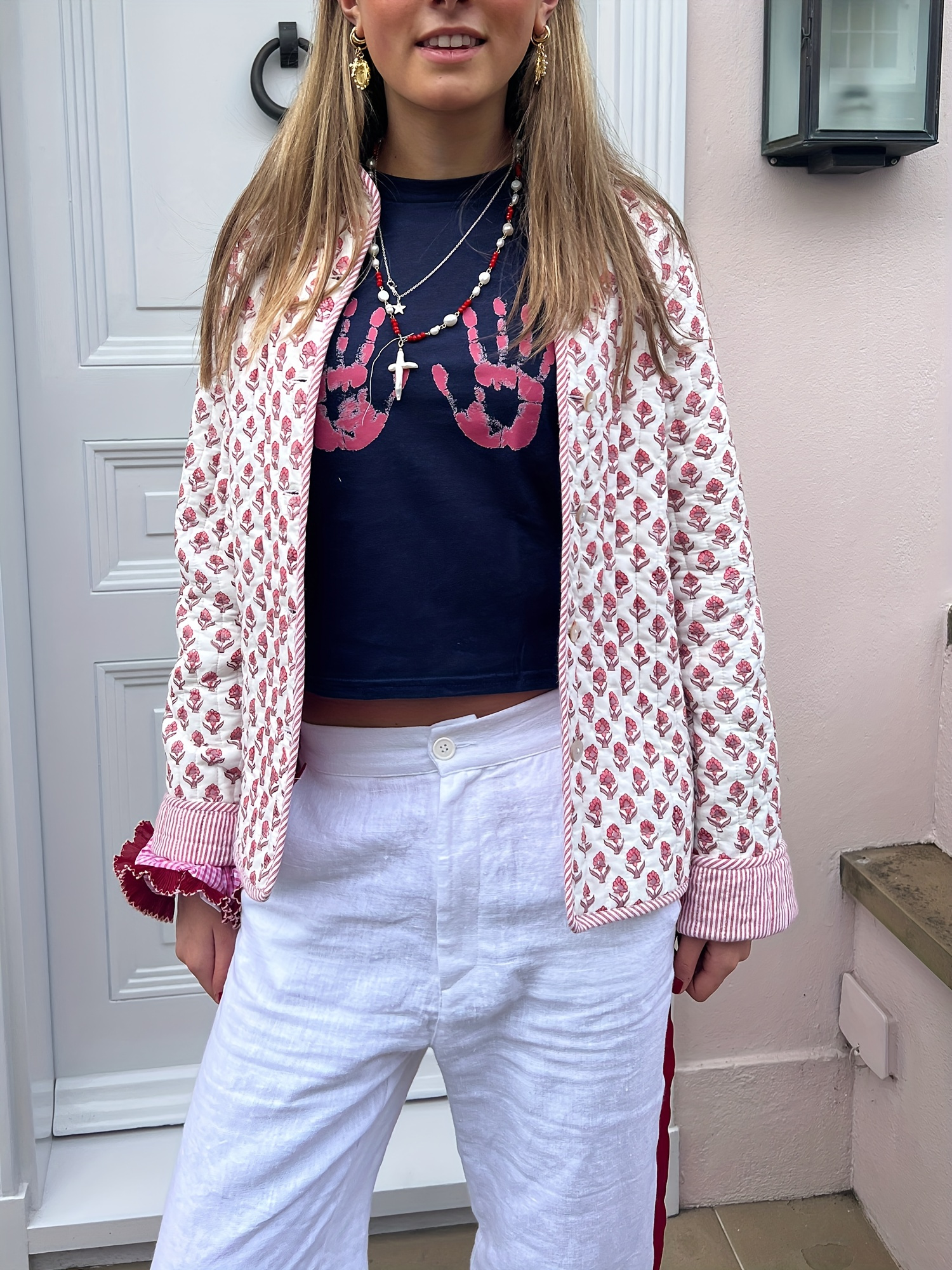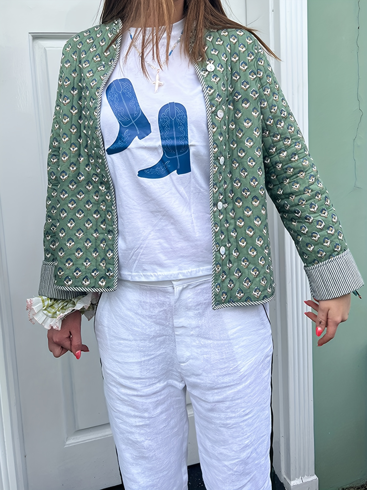 Be the first to review “Women’s Y2K Floral Quilted Jacket – Double-Sided Print, Mock Neck, Long Sleeve Button- Coat, Casual Fallu002FWinter Outerwear, Machine Washable, Green & Beige Floral Design, Cute Jacket”